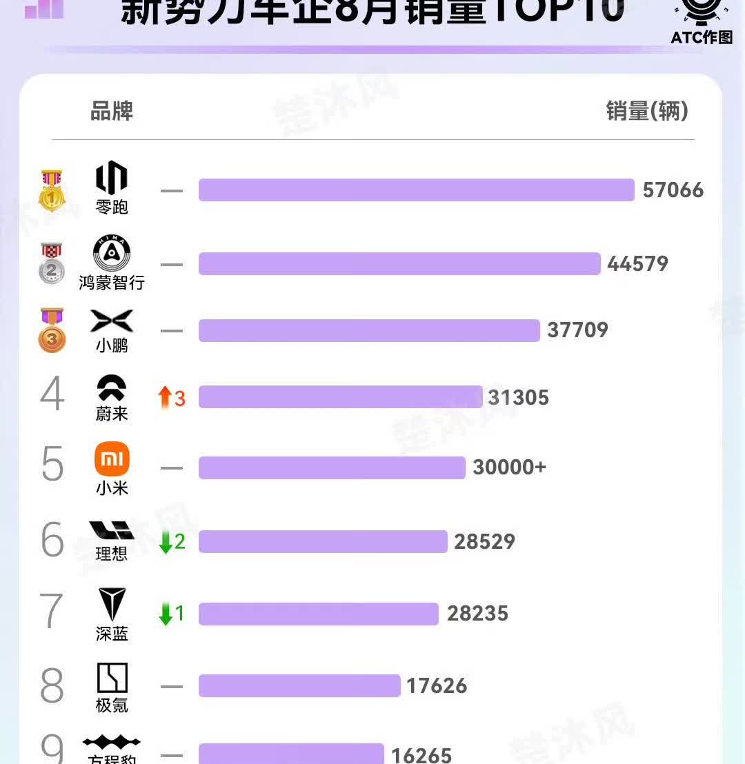 孙少军: 8月销量排名来了! 如果只是按照八月份的整体销量数字来看,零跑已经连续好几个月,在稳稳当当的呆着了! 如果又看数量,还要看单车的价值,那么鸿蒙智行无疑才是真正的大哥! 不过让人欣慰的是,蔚来和小鹏,这两兄弟双宿双飞,都卖了三万多台,而且看目前这个样子,大家下个月会都可能会卖得更好! 其实,现在大家好像现在慢慢地,有点淡化新势力这个概念了,应该说大家进入这个行业,时间都不算早了,甚至随着他们这几年的努力,这些品牌现在都是主力的了。
