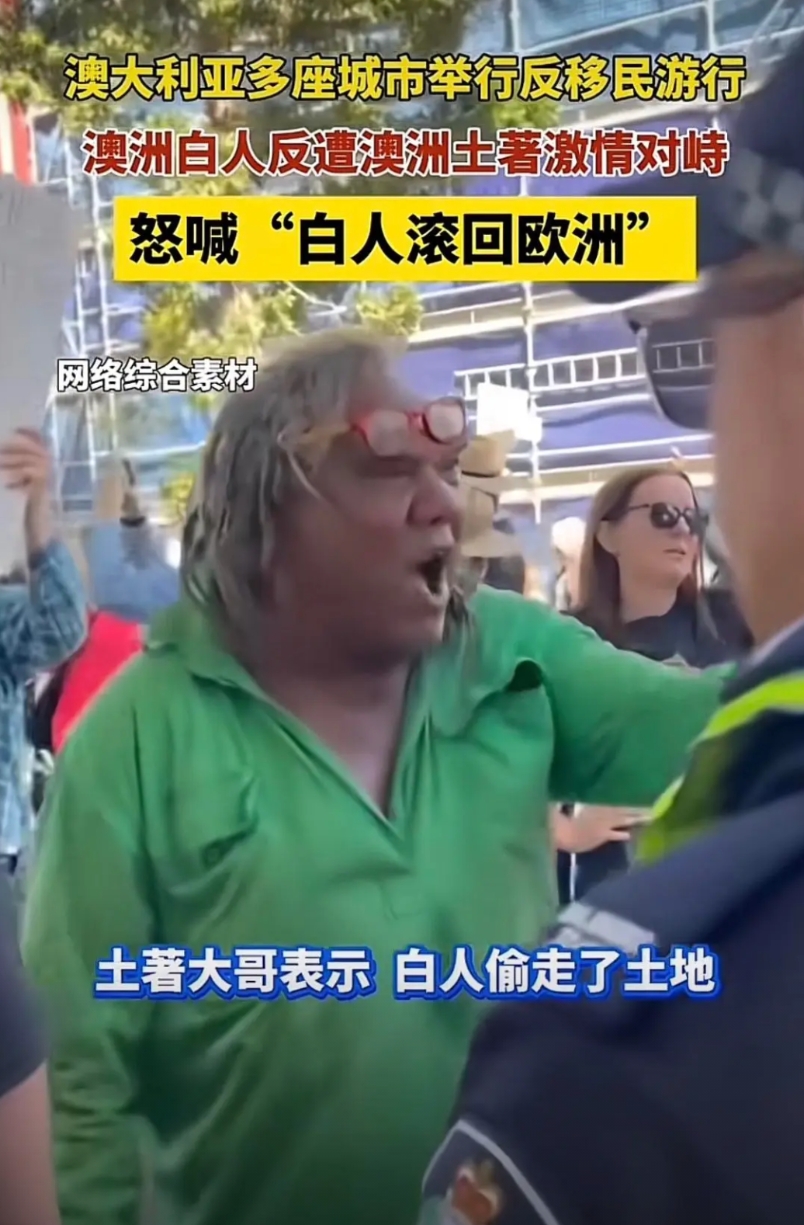 反移民的回旋镖最终还是扎向了白人! 澳大利亚多地爆发反移民游行,当地民众认为,政府过于宽松的移民政策导致外来人员增加,挤占了当地的就业住房资源。 然而这惹怒了当地一位土著大爷,他不顾警察阻拦,大声斥责游行的白人:是你们掠夺了我们的土地,破坏我们的家园,屠杀了我们土著,滚回欧洲去! 果然还得是土著,说话就是这么硬气,因为人家土著确实占理。澳洲在17世纪被发现之前,不同族群近一亿原住民在澳洲大陆和谐共处。结果英国殖民者将大量囚犯和手工业者移送到澳大利亚,不仅带去了疾病造成大量原住民死亡,还对当地土著采取了强制隔离,甚至残忍屠杀等政策。 至今澳大利亚原住民仍在积极争取自己的权益,所以土著大哥如此激动也就不难理解了!