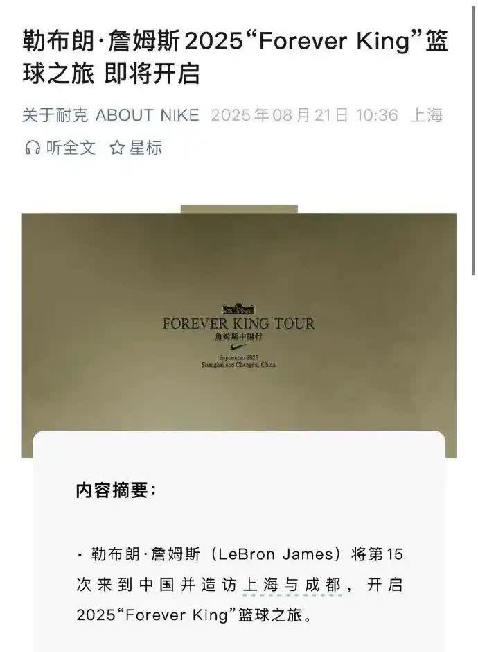 勒布朗·詹姆斯2025年9月的中国行安排已初步确定,具体如下: 上海站:9月1