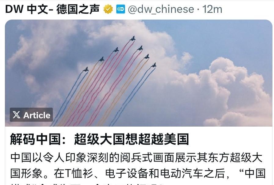 看完我们的阅兵式,德国媒体这是受到了多大的刺激!德国媒体直接下了一个大标题称,解码中国:超级大国想超越美国!9月3日,德国之声刊文声称,中国以令人印象深刻的阅兵式画面展示其东方超级大国形象。德媒称,中国的信号很明确:在未来的世界秩序中,中国想要制定规则。 德媒不讳言的表示,在经济的快速发展之下,中国正在扩大其国际影响力。这一进程的势头仍在不断加强。德媒援引一些知名咨询公司的测算称,这个东亚国家或许会在五年、最迟15年内取代美国,成为世界最大经济体。说实话,看完我们的阅兵式,没想到一贯对我们挑剔,偏见的德国媒体,对我们国家未来的发展如此看好,这确实让人非常的意外。 当然,不管中国是否要超越美国,是否真如德媒所言,在未来的世界秩序中,中国想要制定规则。但有一条可以肯定,看完我们的阅兵式,德媒是深受震撼。说实话,这一次阅兵式,我们展出的武器,确实让人感到过于震撼。东风-41前几天还是“小甜甜”,这才几天,就被东风-61压过风头,成为了“牛夫人”,这一次阅兵式连上场的机会都没有。 东风-5C全球打击,仅仅四个字的评语,就蕴含千钧之力。而在印巴空战中大放异彩的歼-10C战斗机,竟然沦为“表演机”,这确实过于的“奢侈”。而传说中的巨浪-3也是横空出世,而各种反无人机装备,更是让内行人直乎看不懂,没见过,没想到一眨眼从概念竟然变成了现役列装装备。很显然,这样的震慑性阅兵式,不管是国内,还是国外都需要一段时间去消化。有这样的利器在手,我们面对当下复杂国际形势无疑就更有信心了。无疑,我们的国家必定会越来越好。
