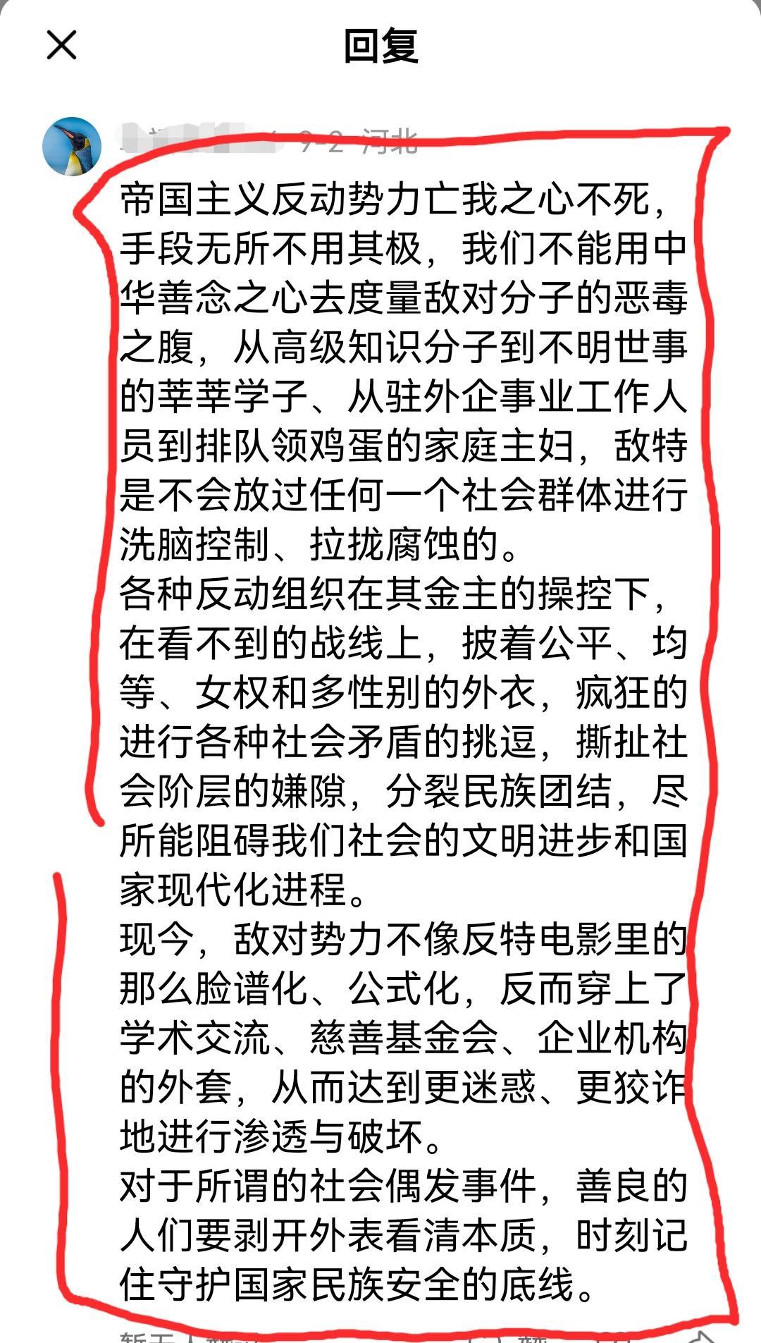帝国主义反动势力亡我之心不死,手段无所不用其极,我们不能用中华善念之心去度量敌对分子的恶毒之腹。从高级知识分子到不明世事的莘莘学子,从驻外企事业工作人员到排队领鸡蛋的家庭主妇,敌特是不会放过任何一个社会群体进行洗脑控制、拉拢腐蚀的。 各种反动组织在其金主的操控下,在看不到的战线上,披着公平、均等、女权和多性别的外衣,疯狂的进行各种社会矛盾的挑逗,撕扯社会阶层的嫌隙,分裂民族团结,尽所能阻碍我们社会的文明进步和国家现代化进程。 现今,敌对势力不像反特电影里的那么脸谱化、公式化,反而穿上了学术交流、慈善基金会、企业机构的外套,从而达到更迷惑、更狡诈地进行渗透与破坏。 对于所谓的社会偶发事件,善良的人们要剥开外表看清本质,时刻记住守护国家民族安全的底线。 以上是一位网友的留言,各位怎么看,欢迎留言分享! #美西方敌对势力# #留言# #头号创作者激励计划#