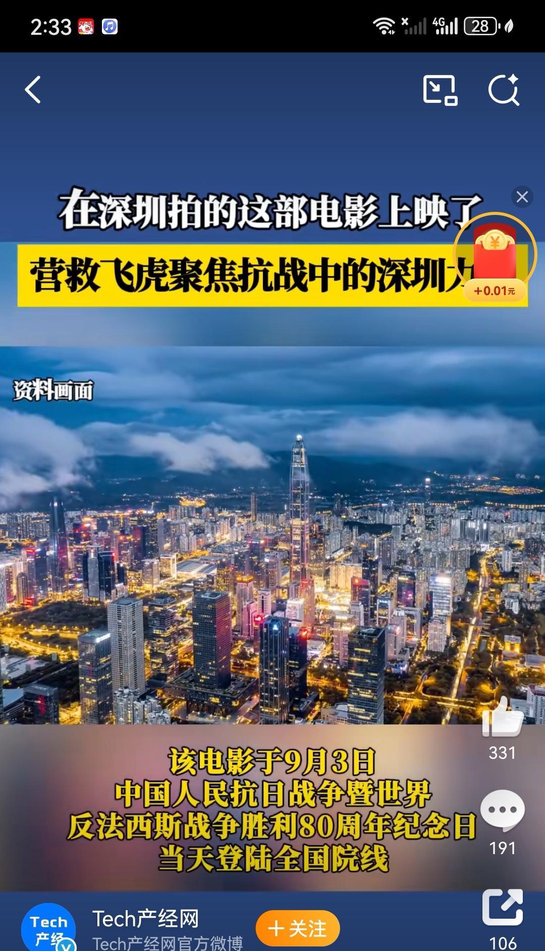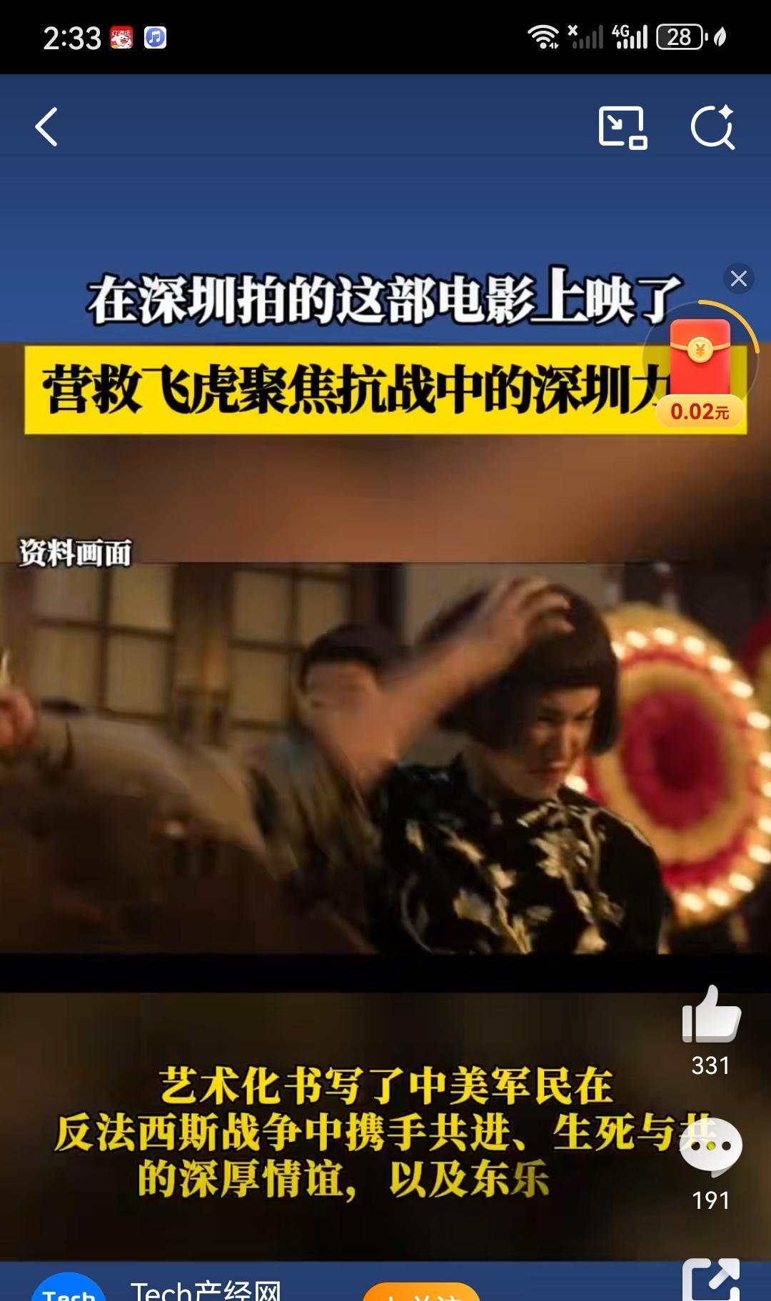 #在深圳拍的这部电影上映了# 电影国家队×深圳影视力量联手打造的《营救飞虎》今日(9月3日)全国院线上映!影片以抗战时期东江纵队港九大队 营救盟军飞行员的真实历史为蓝本,重现那段热血壮阔的过往,借光影致敬抗战胜利80周年,更让“深圳取景”成为银幕外的文化联结~