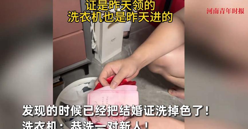 笑不活了!8月31日,浙江杭州,一对情侣在七夕节领完结婚证后,喝酒庆祝,因为喝的太多,一个不注意,结婚证竟然跟着衣服一起进洗衣机里,酒醒后,天塌了!裤子都被染红了,网友:喜上加洗!这辈子都离不了婚了,祝福! 那天,天气还带着点夏天的热乎劲儿,正好前一天是七夕节,不少情侣都选在这时候办人生大事,当地一对小情侣也赶了这个好时候,揣着红本本从民政局出来,脸上的笑就没断过。 领完证肯定得好好庆祝,俩人找了家餐馆,点了几个爱吃的菜,还开了酒,想着这日子特殊,越喝越高兴,不知不觉就喝多了,晕晕乎乎地回了家。 到家后俩人头也昏、眼也花,随手把身上的衣服一脱,连同装着结婚证的口袋也没顾上掏,就一起扔进了洗衣机里,接着倒头就睡,完全忘了这茬事儿。 等第二天中午俩人醒酒了,头疼得厉害不说,想起要晾衣服,走到洗衣机跟前一打开,瞬间就懵了,洗衣机里的水泛着红色,再一看,那本崭新的结婚证泡在水里,封面的红颜色都晕开了。 里面的照片和字也变得模糊不清,更糟的是,一起洗的裤子也被染成了红色,看着特别显眼,俩人当时都慌了神,这结婚证可是重要证件,刚领一天就成了这样,简直像天塌下来一样。 后来这事被他们发到网上,网友们看了都乐坏了,纷纷留言说“这真是‘喜上加洗’啊”,还有人调侃 “这么一洗,这辈子都离不了婚了,必须得好好过,祝福你们”。 不过也得提醒大家,重要证件可得妥善收好,别像这对小情侣一样,因为一时大意添了麻烦,虽说最后成了好笑的插曲,但要是真影响到证件使用,那可就麻烦了。 信息来源:《小夫妻七夕领完证喝酒庆祝,喝多后将结婚证扔进洗衣机,酒醒后天塌了:裤子都染红了》观象视频