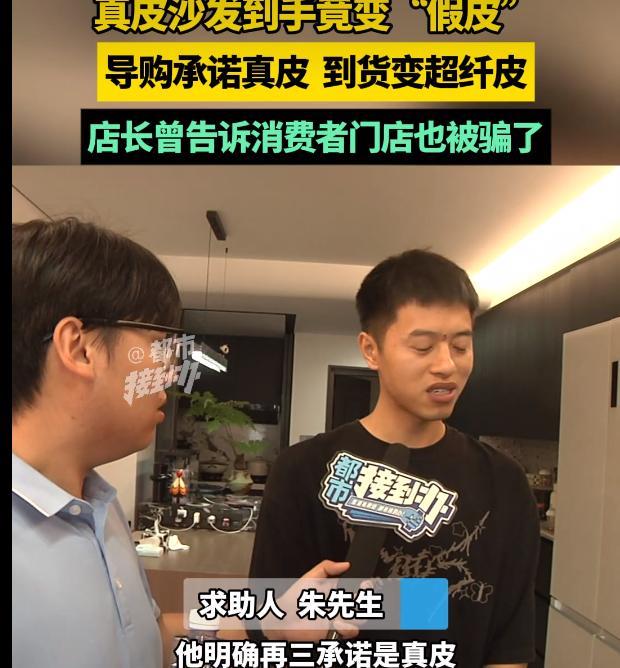 河南一男子花9700买“真皮沙发”,结果到手发现是“假皮”!找到门店理论,门店居然说:“这是导购个人行为,我们也是受害者……” 谁能想到,去正规家具城买个沙发也能遇到骗子。 2024年3月,家住河南郑州的朱先生给新家装完修之后,就去当地的家具城买家具。 挑了很久之后才挑中了一款黑色的沙发。 朱先生在和导购交流的时候一直在反复强调,要真皮、头层牛皮的沙发,而导购也跟他承诺,就是头层牛皮,要价11000以上。 朱先生想了想,觉得这个价格确实是真皮沙发的,于是就开始和导购砍价,砍了半天之后对对方承诺以9700块钱的价格把“真皮沙发”卖给他。 刚装修的房子,一般是不会住的。朱先生等了一年才住进新家。在和他人交流的时候得知真皮沙发有溯源卡能溯源。 结果直到此时朱先生才发现自己新买的沙发竟然没有这“溯源卡”。他赶紧找店长要说法。 结果店长问清楚他购买沙发的时间之后,却“大吃一惊”:“不对啊,我们去年11月才进的头层牛皮的那个沙发,你那个沙发应该是超纤皮的。” 合着自己花了小10000块钱就买了个假皮沙发?这不是欺骗消费者吗? 结果店长竟然把锅甩给了导购,说对方明知道店里面这个款式的沙发没有头层牛皮的,却为了成这个单把沙发卖给你,她不只是骗了你,也骗了我们,其实我们也是受害者。 还说导购人员早就已经离职了。 朱先生说店里退他两千块钱这件事就当过去了,但店长却说冤有头,债有主,导购人员骗的他,让他去找导购。 朱先生一气之下找到了记者,并和记者一起找到了家具城,对方也表示愿意帮忙协商。 那么这种情况,门店说“不知情”是否就能逃脱责任呢? 答案很明显:不能。 朱先生是和门店签的合同,不是和导购签的合同。根据《民法典》第577条:“当事人一方不履行合同义务或者履行合同义务不符合约定的,应当承担继续履行、采取补救措施或者赔偿损失等违约责任。” 导购将沙发卖给朱先生,属于职务行为,法律后果也应该由用人单位自己承担,这不是说“不知情”就能够免除责任的。 这种情况,朱先生是可以要求退一赔三的,朱先生只要求退两千已经属于十分厚道的行为了。 但店却连2000都不想退,属实是法律意识有待提高。