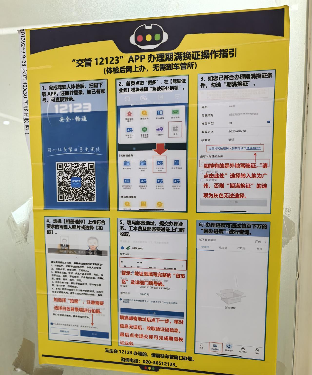 今天去体检更换驾驶证了,也算是个老司机了,6 年了!简单说一下步骤。 1、 在交管 12123 上面查看附近哪些医院支持驾照体检。预约附近的医院,选择驾照体检,费用 35 块。我这边广州周末无法预约! 2、去医院体检,过程大概 5 分钟,4 个步骤,a 先在一个密密麻麻色块的小本子上,找出特定颜色的数字,说实话刚开始看还有点怀疑自己,离远一点看就很好看清楚。 b 量身高体重。c 测视力,担心我视力看不清,毕竟很久没换眼镜了,但是大概能看清,过了!d 举起双手伸直手指拍张照片。做完后马上出结果! 3 、体检结束后,交管 12123 上马上会显示已体检,无需等待结果!接着根据流程填写内容就好了,可以快递,可以去现场取,快递费 25 元,制证费用 10 元。总费用 70 元 全部搞定!