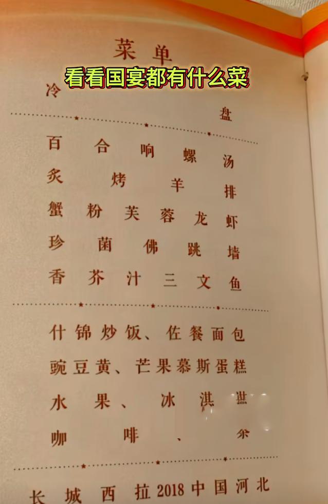 淮扬菜唱主角! 九三招待会的菜单,考虑到各国政要的饮食习惯,不宜太辣,所以以清淡的淮扬菜为主,看看他们都吃了啥。 有羊排,龙虾,佛跳墙,三文鱼,而主食是什锦炒饭,还有面包、蛋糕,冰淇淋,水果、咖啡,茶,红酒和长城白葡萄酒。
