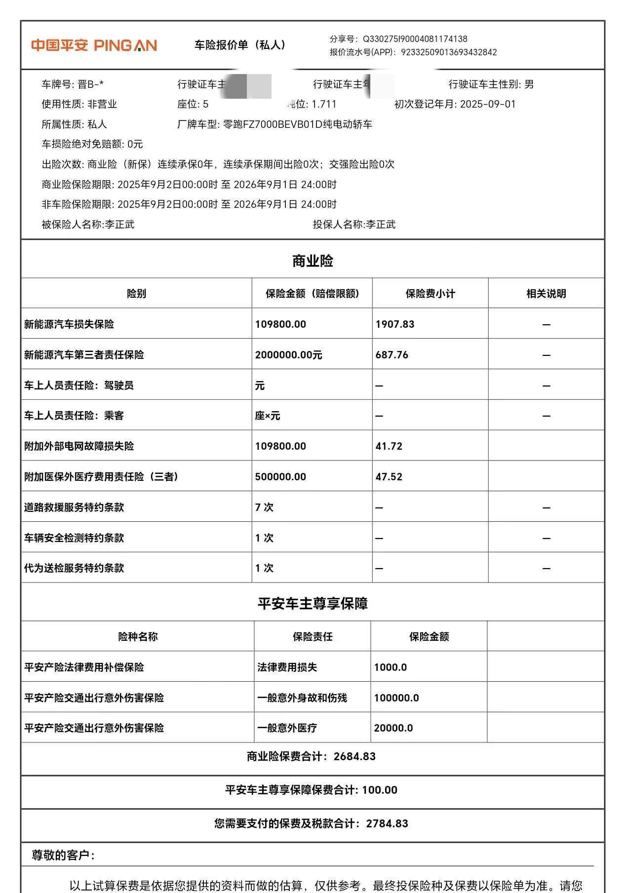 都说电车保险贵,刚提了零跑b01,上的平安车险,商业险报价2780多扣除返点后2