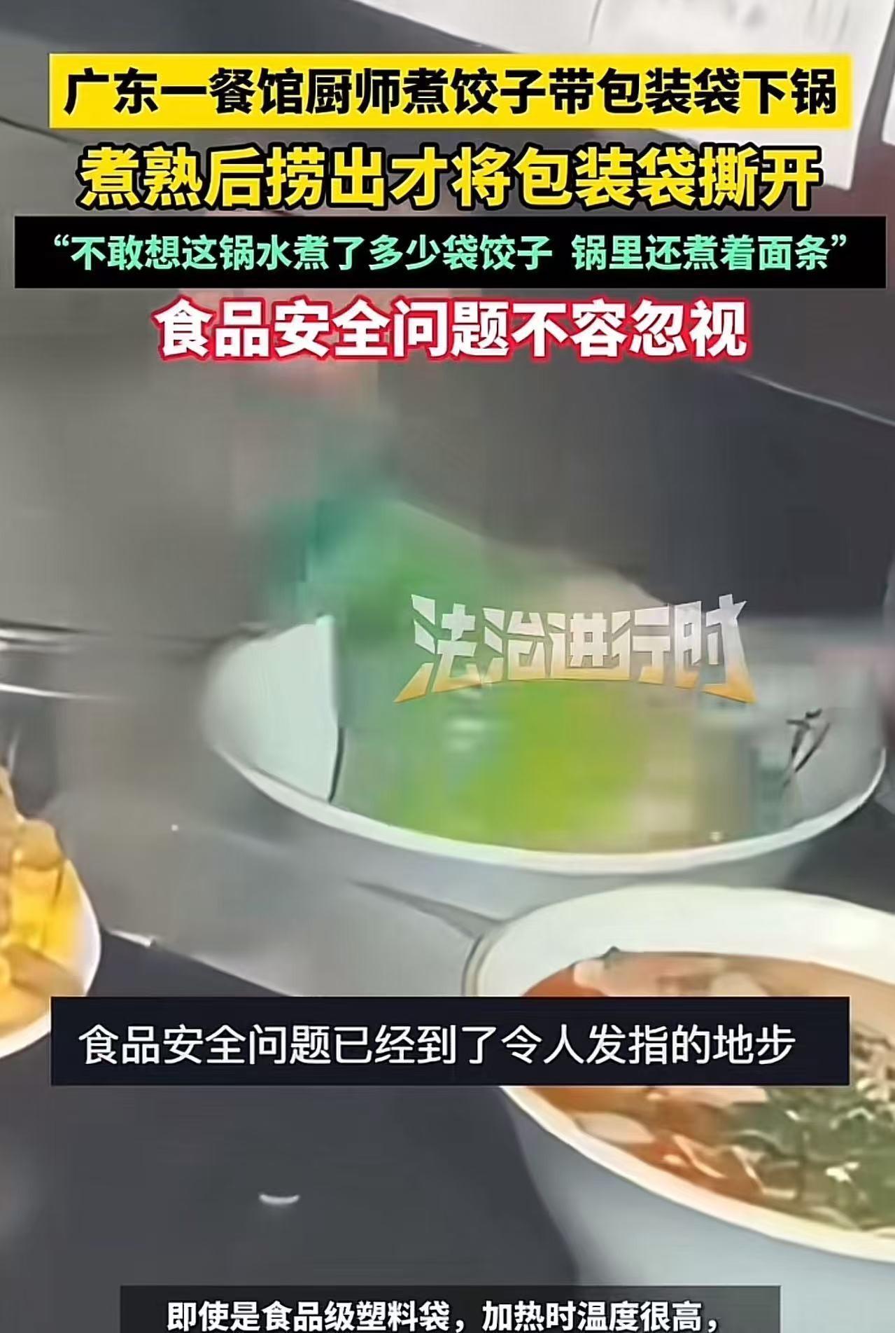 “食品安全问题已经到了令人发指的地步!”广东,食客去餐馆吃饺子,竟然看到厨师煮饺子时带着包装袋下锅,煮熟后才将包装袋撕开!网友:“不敢想象这锅水煮了多少袋饺子,锅里还煮着面条!” (来源:法治进行时) 食客懒得做饭,就去餐馆吃,没想到老板也懒得做,饺子不是现包的,是袋装的速冻饺子。 而且老板觉得煮饺子换水麻烦,竟然直接带着包装袋下锅,等饺子闷熟后再捞起包装袋撕开。 这一幕让食客彻底惊掉了下巴,眼睛瞪得像铜铃一样大,脸上写满了震惊和难以置信。 他心里想着,饺子不是现包的也就算了,自己勉强还能忍一忍!可这带着塑料袋下锅煮的饺子,能吃吗?这老板也太不负责任了吧! 即便是食品级塑料袋,在加热的时候,锅里的温度会变得很高。一旦温度超过了塑料袋的熔点,塑料就会开始变热变形,甚至有可能熔化,然后黏在食物上。想到这里,他的后背不禁冒出一阵冷汗。 更让他气愤的是,锅里当时还不止煮着饺子,还有面条在翻滚着。这意味着,那些微塑料很可能已经混进了面条里,吃进肚子里去了。 他忍不住在心里怒吼:“这老板有没有考虑过吃面条的人的感受啊?这吃进去的哪是面条,分明就是健康隐患啊!” 食客越想越气愤,毫不犹豫地掏出手机,发到了网上,提醒大家一定要避坑这家餐馆!! 此事引发了热议,有网友,塑料如果进到血液里,会得各种癌症,世卫组织已经公布过,南方不知道,有些餐馆为了省事,直接给碗套上一个塑料袋,装滚烫食物,如面条粥,馄饨,豆浆等,遇到这种情况,转身就走,健康重要! 也有网友说,这算什么!我是外卖员,预制菜都是袋子直接放锅里加热,然后倒在米饭上就完事了! 还有网友说,这个厨师人性已泯灭了,让他进去踩缝纫机,多踩几年!不要祸害大家了! 餐饮行业的底线是对食客健康的守护,而非为图一时便利而肆意践踏安全红线。 老板为省换水之麻烦,置食客健康于不顾,这种短视行为不仅是对消费者权益的公然漠视,更是对餐饮行业基本道德的严重背离。 若连基本的食品安全都无法保障,这样的餐馆又怎能在市场上立足?消费者用脚投票,终会让这些无视健康与责任的经营者自食恶果!