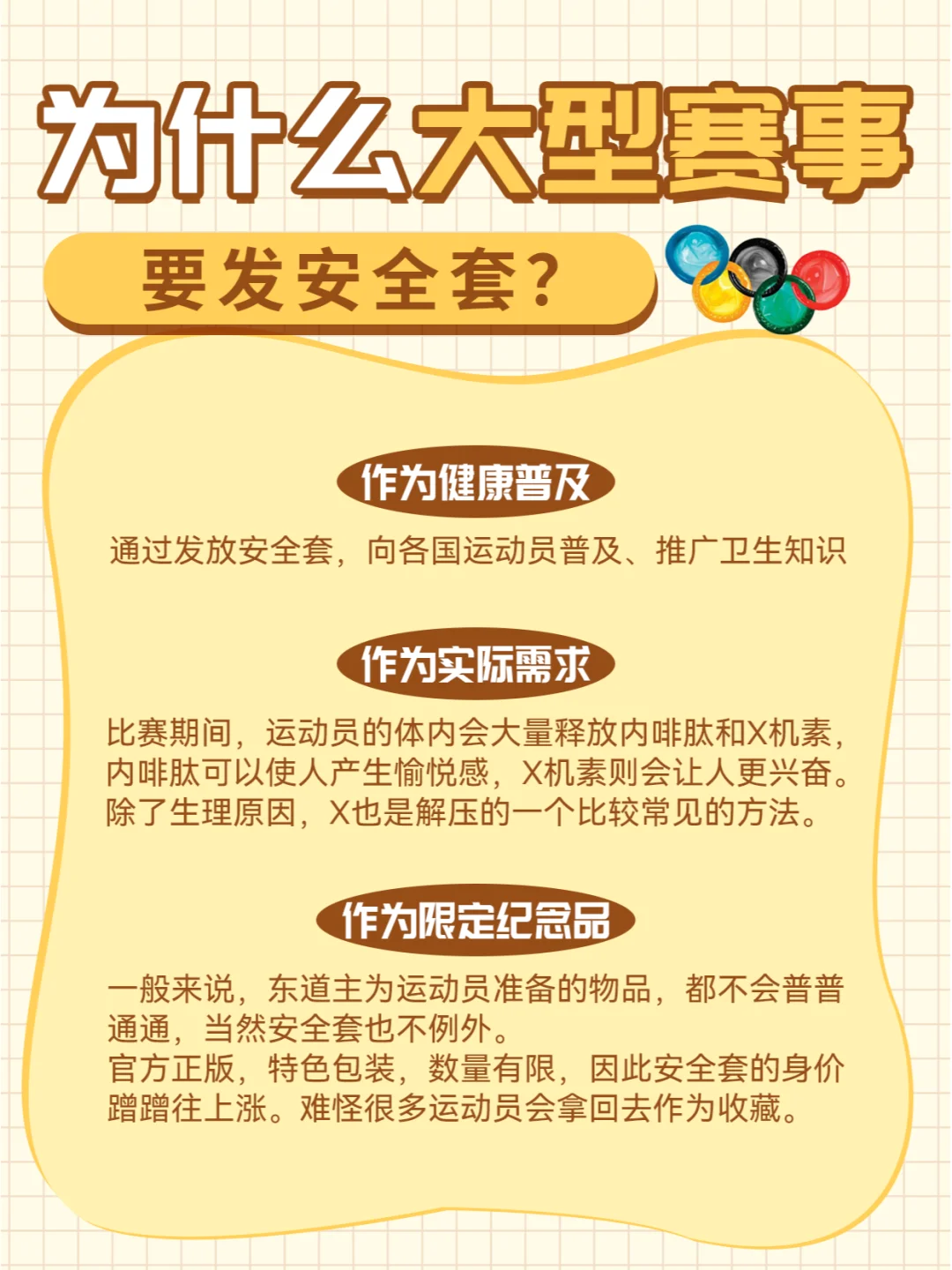 毕竟是大型赛事,套套怎么能普普通通?还记得北京冬奥会的冰墩墩有多么抢手吗?据国外运动员反馈:比冰墩墩更难搞到的,是官方套套。因此有人这么安慰运动员:拿不到奖牌和吉祥物,就拿两个安全套回去收藏也是不错的