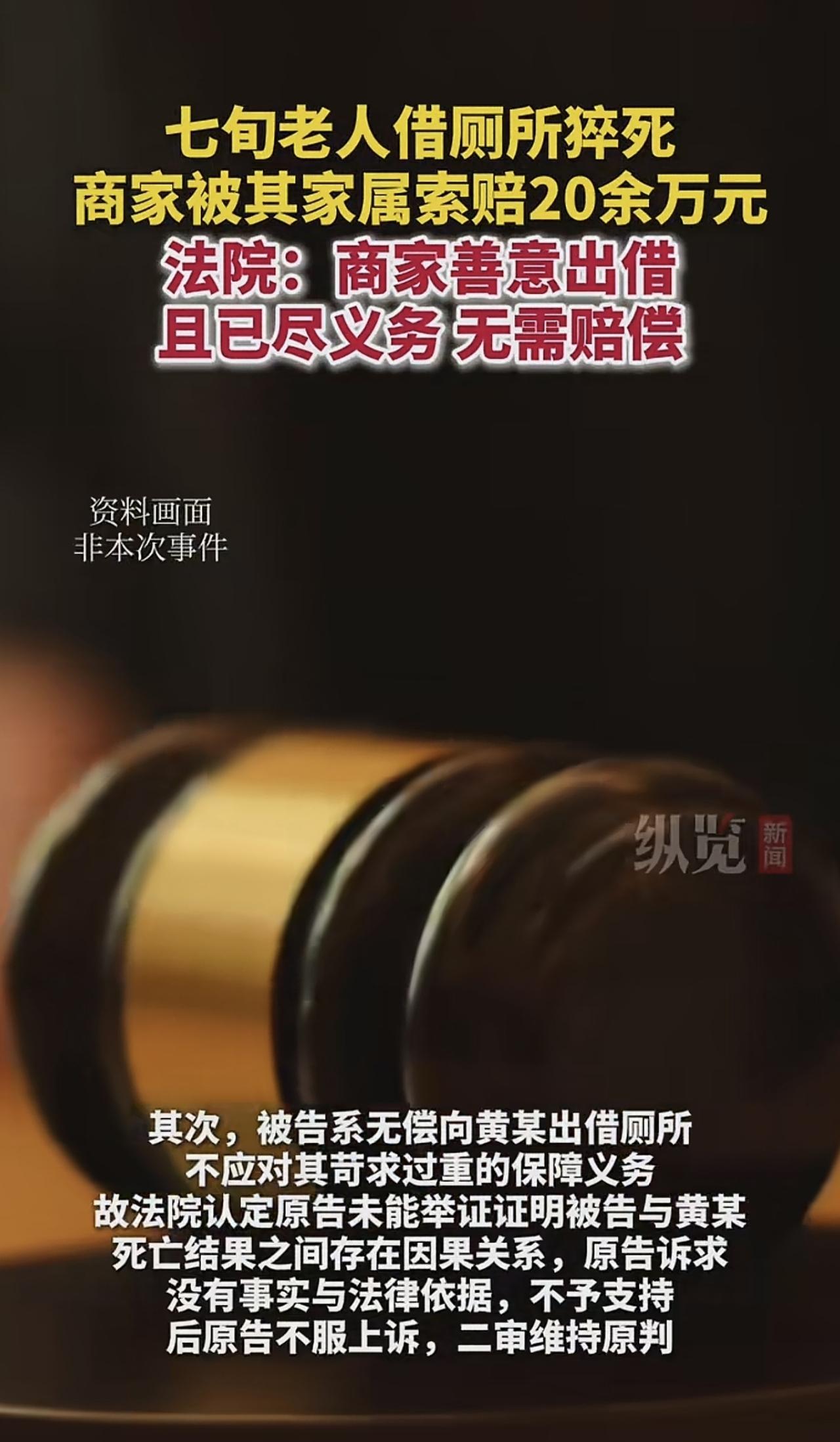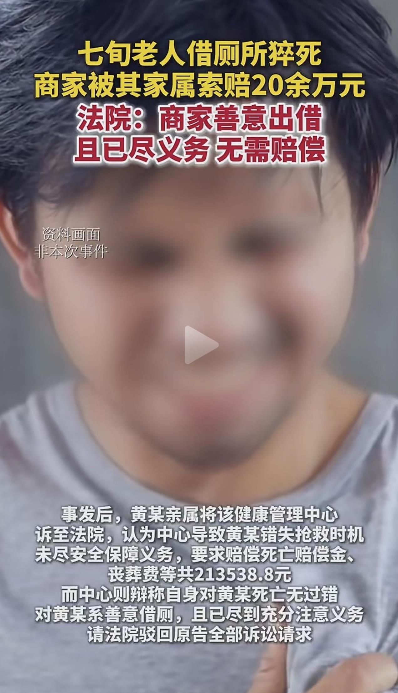 广东佛山,一70岁大妈,去某家店借厕所小便时突然猝死,老板惊讶的发现,店里的一间厕所长时间被反锁,感觉不对劲,敲门没人回应,就打120并撞开门,才发现大妈死亡多时,大妈家属愤怒的把老板告上法庭,索赔213538.8元,案子经过两审,最终的判决出乎意料。 2024年8月27日,70岁的黄大妈去某健康管理中心养生,因为在家里喝了不少茶,她有些尿急,就借用店里的厕所小解。 店员把卫生间指给了黄大妈,然后就忙自己的事去了,谁都没有想到,黄大妈把厕所门反锁后,竟然突发疾病,猝死在里面。 这个意外悄无声息,谁都没发现异常,直到店老板马某和店员谢某发现,店里有间厕所,长时间被反锁,才感觉不对劲。 刚开始,她们以为有人在里面方便,就没当回事,但每次如厕,这间厕所都被反锁,里面的人好像就没出来过,这就有点反常了。 这时,有个店员才想起来,黄大妈进去上厕所,一直没出来过,马某预感到大事不好,赶紧和店员们敲门,里面一点回应都没有她们彻底慌了神,猜测黄大妈可能出事了,赶紧一边打120,一边砸门。 最终,门被砸开了,眼前的一幕,让大家倒吸一口凉气,黄大妈已经死亡多时,没有生还的可能了。 黄大妈的家属愤怒的把马某告上法庭,索赔213538.8元,在他们看来,黄大妈的死亡,马某负不可推卸的责任,如果她及时发现,黄大妈不可能失去抢救的机会,马某没尽到安全保障义务。 而马某觉得自己比窦娥还冤,首先,她是好心借厕所给黄大妈用,自己是好心没好报,还惹祸上身。 其次,黄大妈是死于自身疾病,而不是店里的侵害,店里忙,谁都不可能盯着黄大妈如厕多久了?怎么还没出来?她们发现异常后,已经第一时间打了120,并砸门施救,何错之有? 有人认为,这不是简单的责任认定问题,如果这判定为主人有过错,赔偿老人家属,实际上最大的危害是分解人与人之间的信任,互相帮助,团结就一定会被破坏,社 会上的人就会成为一盘散沙。这种危害必将长远。 还有人说,这种敲诈的还是少数人,我家的宾馆有个老人心梗突发,我父亲给他送到医院,还垫付了5000块,结果没救活,他儿子从外地过来,不但没有讹诈,还一个劲的感谢,除了垫付的医疗费还要多付两千,我父亲没要,讹诈人的还是少数人。 我觉得,现在好像有一种奇葩的现象。如果有人遭遇意外死亡或者受伤,有些家属的反应不是悲伤,而是有没有人该为这个意外负责并赔偿。甚至是一定得找个人来负责并索赔。 为啥提出索赔的人败诉了,却没有得到惩罚,法院至少应该象征性的要求他们赔礼道歉,并且支付10000块钱的罚金,不然,以后会有更多人无理索赔,反正败诉了也安然无恙。这样的恶意索赔,既浪费了司法资源,又给好心借厕的商家带来很多麻烦,并且耽误商家很多时间来应诉。法律应该公平公正。 那么,法院会如何判决呢? 黄大妈家属认为健康管理中心老板马某未尽到安全保障义务,导致黄大妈错失抢救时机,因此要求其承担赔偿责任。 然而,法院经审理查明,健康管理中心允许黄大妈借用厕所,这本身是一种超出经营范畴的善意行为。 并且,没有证据表明店内厕所存在安全隐患,老板马某和店员在发现厕所长时间反锁、敲门无人回应后,立即拨打了120并撞开门查看情况,已经尽到了合理限度内的安全保障义务。 《民事诉讼法》第67条规定:当事人对自己提出的主张,有责任提供证据。 黄大妈家属向法院提出索赔213538.8元的主张,那么就有责任提供证据来证明健康管理中心存在过错,且该过错与黄大妈的死亡结果之间存在因果关系。 但在实际案件中,家属提交的证据不足以证明健康管理中心提供的活动场所存在安全隐患、未尽到安全保障义务而导致黄大妈死亡。 根据此条法律规定,由于家属无法提供充分有效的证据支持自己的主张,所以要承担举证不能的不利后果。因此,法院最终驳回了黄大妈家属的诉讼请求。 一审判决黄大妈家属败诉,家属不服,提起上诉,二审维持原判。 综上所述,一审和二审法院的判决是依据相关法律规定,综合考虑案件事实作出的合理判决。这一判决既维护了法律的公平公正,也保护了善意施惠者的合法权益,避免因不合理的索赔给社会带来不良影响。 关注@灋律盐究员 学法辩是非,用法止纷争。 信源:纵览新闻2025-9-1