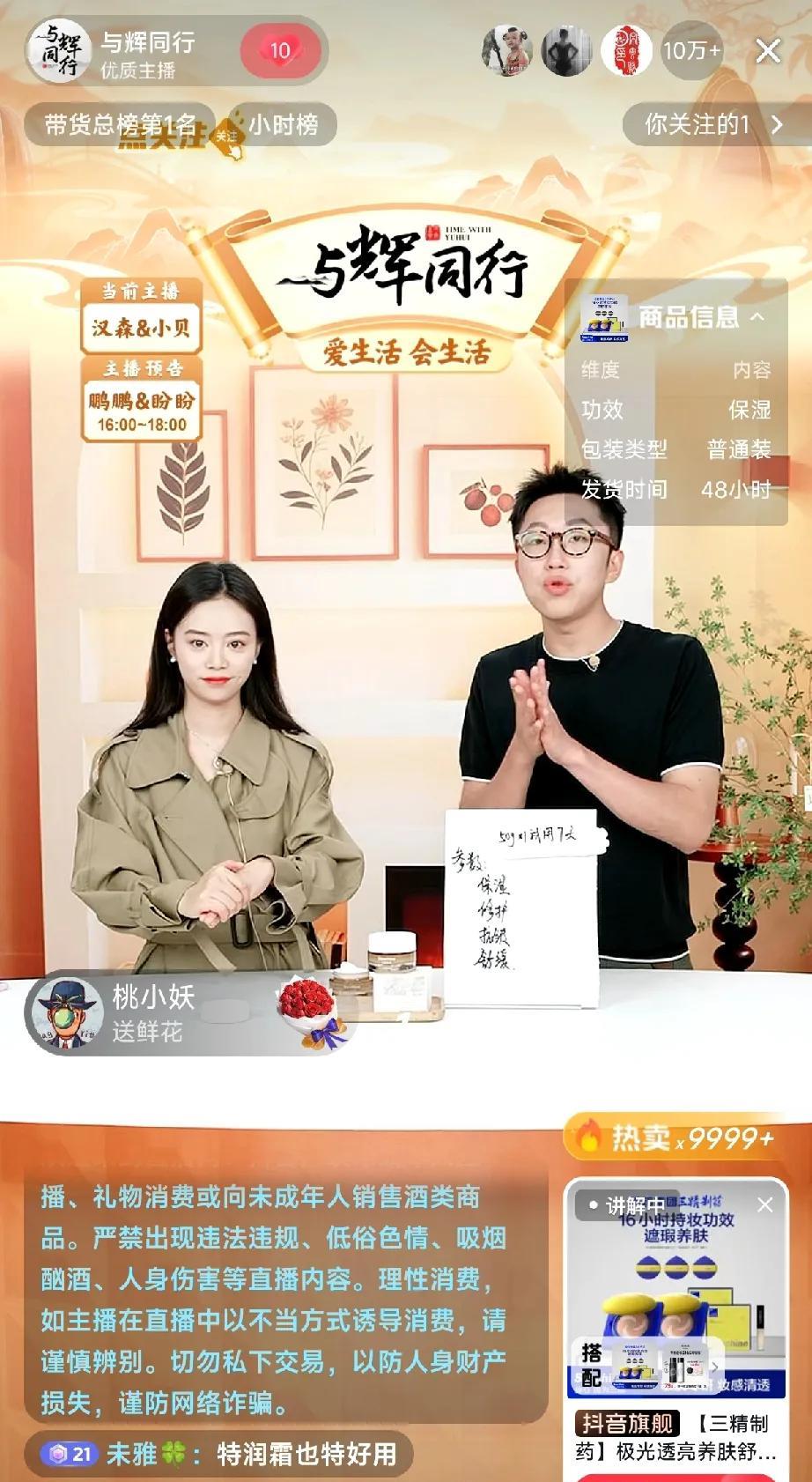 10万+! 与辉同行今天下午两点开播,在线人数竟然半个小时内都是10万+,要知道这不是宇辉上播啊!只是汉森小贝上播的时间,要是宇辉上播岂不是更热闹! 宇辉今天被邀请现场观看阅兵仪式了,兴奋的这家伙连发了五个视频,海陆空武警方阵全有了!有网友要求他把女兵方阵视频也发出来,不知道这愿望能不能被满足。 董宇辉发布的视频也登上了热搜榜,“和董宇辉一起观礼九三阅兵”,接连几个视频都标注热榜字样。 起初以为全部是宇辉的效应带动了10万+的在线,后来一看,不完全是,还有受宠的三精护肤品热卖。 很多人在黑龙江行的时候,没有买到,这次说啥也不能错过,还有很多复购的朋友们。 很多网友说宋宋好帅,和董董有一拼,只有少数网友知道,宋宋和董董一样,都是已婚状态啦! 今天又是汉森和小贝的双播,很多因素柔和在一起,这10万加在线持久不散,真的是太给力了! 与辉同行半小时涨粉3000,还在持续上涨中!