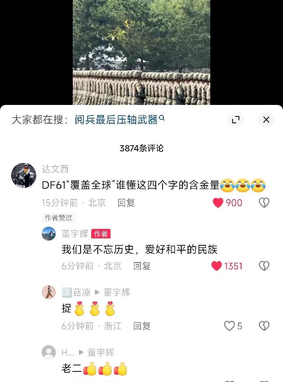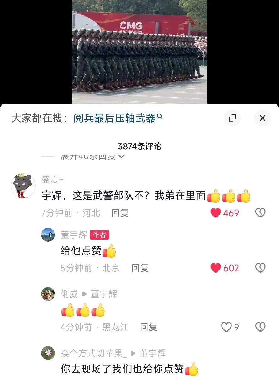 董宇辉视角下的阅兵! 有多少猜测到董宇辉会出现在阅兵现场的五万人中?相信不止我一个人! 我是啥时候更加确认的,星期一晚上,宇辉离开直播间之前,说明天他们都看阅兵,包括所有工作人员,这是值得记录的日子。他那会儿说的是“他们”而非“我们”心里就更加确信他会出现在现场。 很多明星大咖企业家在收到邀请后,抑制不住兴奋发了朋友圈,开了直播,宇辉一句都没提,观礼结束后第一时间更新了动态。 网友达文西说,DF1覆盖全球,谁懂这四个字的含金量? 董宇辉回复说,我们是不忘历史,爱好和平的民族。 网友剩下说,宇辉,这是武警部队吗?我弟也在里面。 董宇辉回复,给他点赞。 网友们说,你去了现场,我们也给你点赞。 自己特别关注的两个人董宇辉和孙颖莎,都是特别有能量的年轻人!