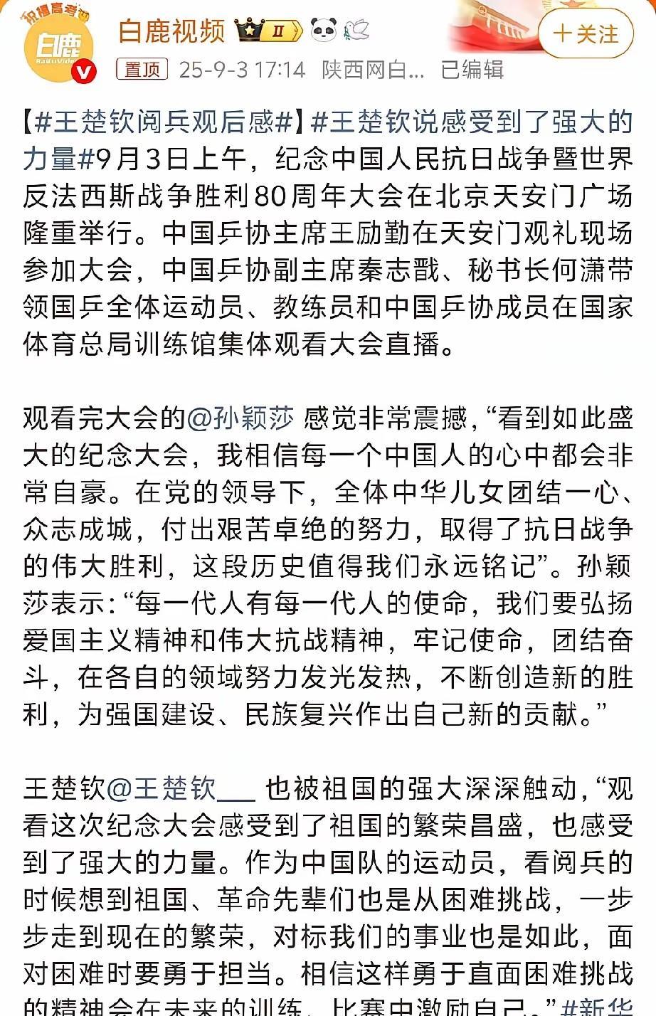 王楚钦更新动态了! 楚钦今天看完阅兵式,更新了社交动态! 表达了自己心情久久不能