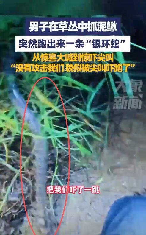 “这就是命啊!”近日,浙江义乌,一男子晚上在河边抓泥鳅,意外发现了一大窝泥鳅,于是兴奋地叫了起来,不料,这却吓到了草丛中的银环蛇,快速爬了出来,然后当着男子的面溜走了!并没有发起攻击。网友:吵到人家睡觉了! 泥鳅是一种夜间活动频繁的鱼类,晚上温度降下来后,它们会悄悄来到岸边捕捉小虫子、扁螺等吃,也正因泥鳅喜欢晚上活动,所以有经验的人都晚上来到河边捉泥鳅。 据媒体9月2日的报道,当时王先生和朋友打着手电、提着桶来到河边,在草丛中搜寻着泥鳅。 王先生拨开草丛后,发现了一大窝泥鳅,众人见状兴奋的叫出了声,不料,这却惊扰到了在附近休息的银环蛇。 吓得它从草丛中飞奔而出,一溜烟就跑没影了,而众人看到有蛇后,也被吓得叫的更大声了。 银环蛇虽然有剧毒,但是它的胆子比较小,一般不会主动攻击人,除非是受到了威胁。由于银环蛇也吃泥鳅,所以常分布河边,通常也是晚上出来觅食,喜欢野钓的朋友应该会见到。 网友看后表示,说他们运气不好吧,抓到了一大桶的泥鳅,说他们运气好吧,又遇到了剧毒的银环蛇,只能说这就是命吧! 信息来源:《9月2日(采访时间),浙江义乌一男子在草丛中抓泥鳅,突然跑出来一条“银环蛇”,“没有攻击我们 貌似被尖叫吓跑了"》大象新闻
