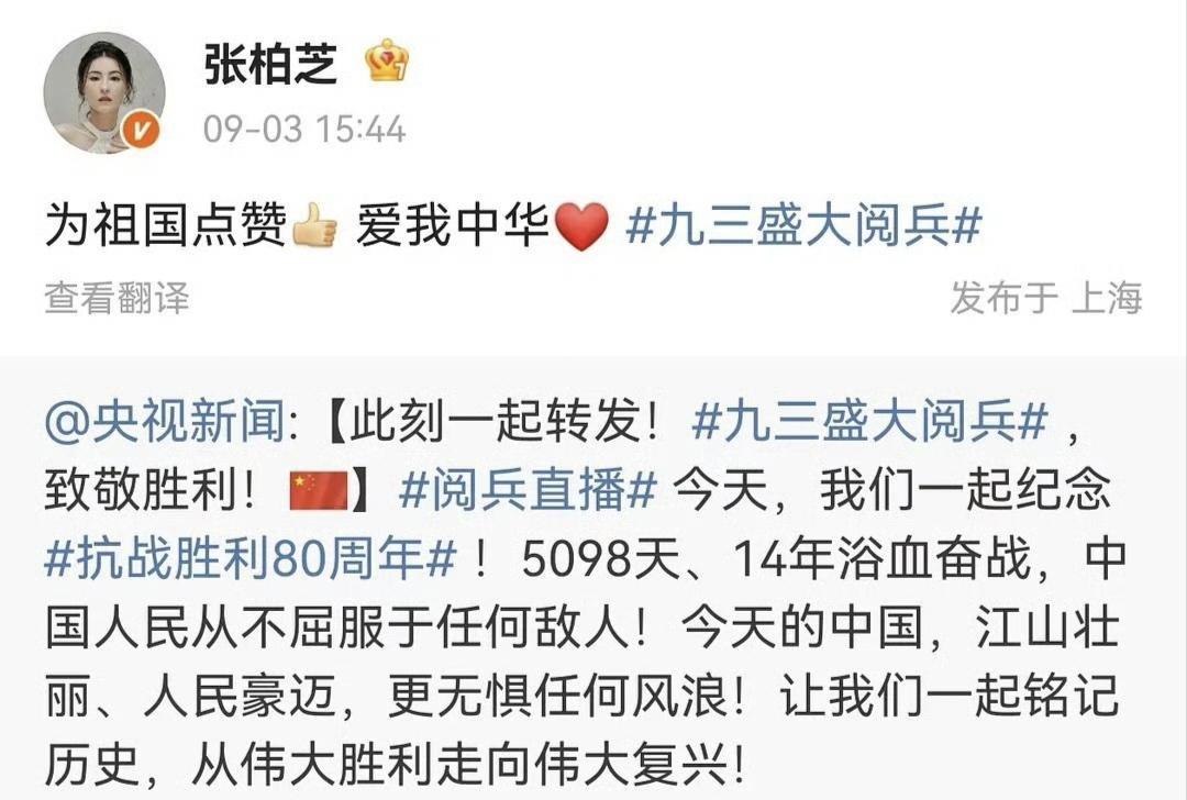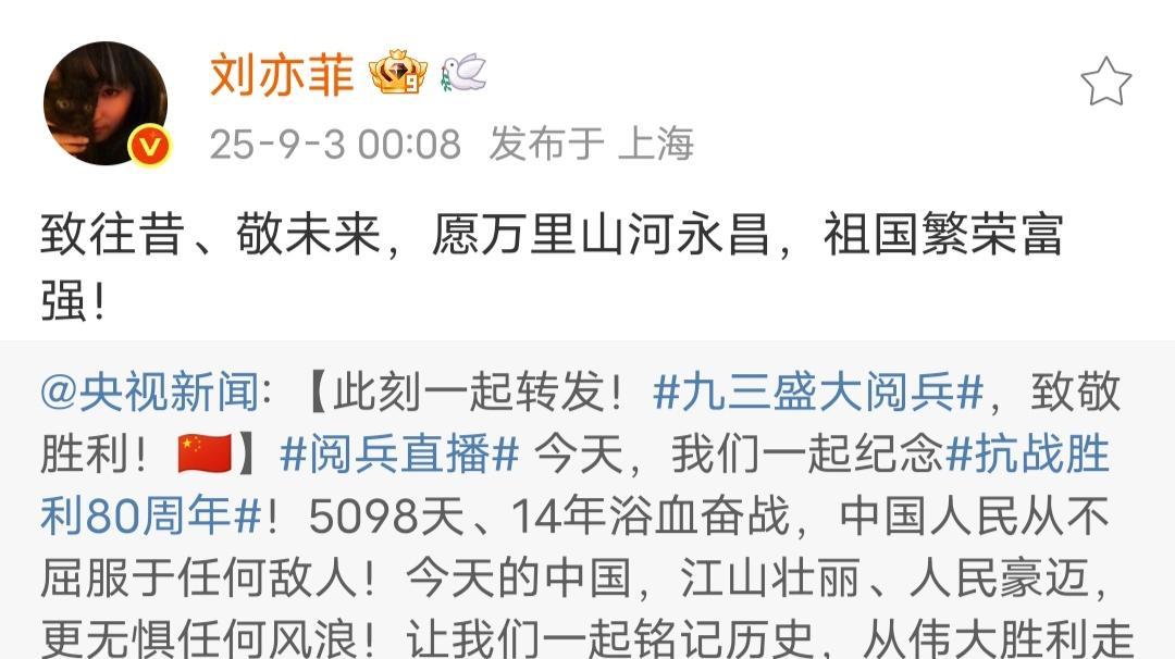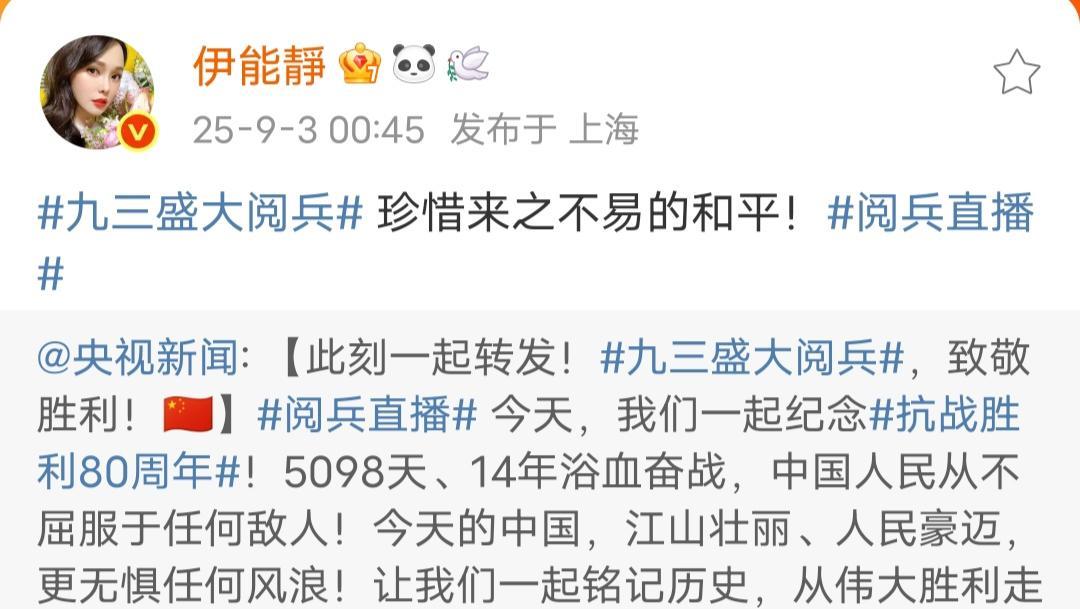 今天第一个发阅兵的台湾省艺人是舒淇,第二个是伊能静。截止目前,王心凌、张韶涵、陈妍希、杨丞琳、蔡依林等在内地疯狂捞金的艺人们还没有任何表示。 内娱90%的艺人明星都转发了阅兵,以前在转发方面一直被网友审判的刘亦菲,这次仍旧我行我素,虽然转发了内容,但还是和以前一样,不带任何话题。 应该夸一夸的是张柏芝,她内网和外网同时发文,值得点赞!