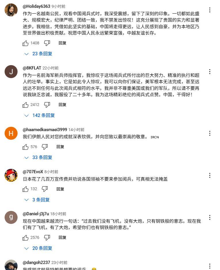 这次阅兵的视频在油管倒是没被限流,美联社发的阅兵视频有100万播放量7000多评论,我看了下热门排序的留言大多比较友好,看样子阅兵的效果还是不错的,他们眼神清澈了不少。