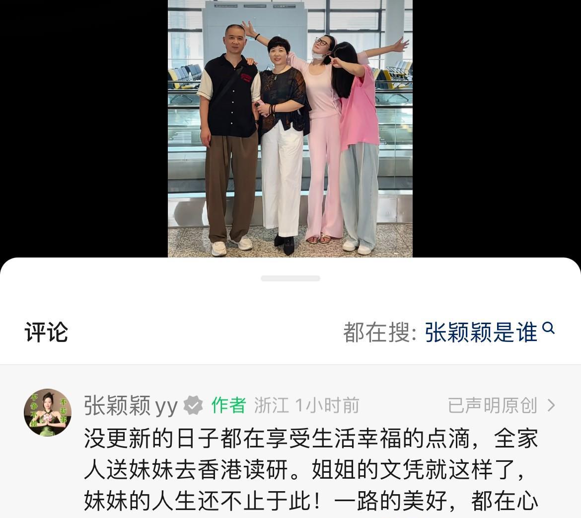 刚刚张颖颖更新了视频, 又做了一件大事。 正如她所说,没开播的日子十分幸福。 原来是她妹妹去香港攻读研究生, 一家人去送行,还顺便旅游了一番。 有没有发现? 张颖颖的妹妹每次都不愿露脸, 弟弟如今则和张颖颖一起投身直播行业。 一家人都因张颖颖而过上了幸福生活。 现在张颖颖对当下的家庭生活颇为知足,有爸爸妈妈、弟弟妹妹相伴,她就是家里的大女主,甚至连谈恋爱都不在意了! 网友调侃道:或许家人就是张颖颖最大的底气。 #秋日生活打卡季#