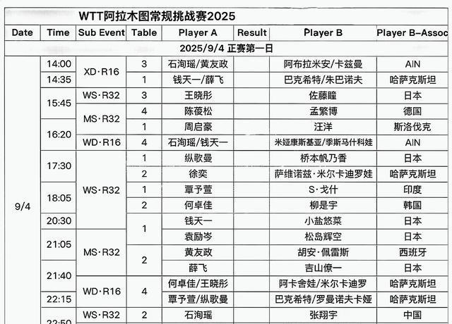WTT常规挑战赛阿拉木图站2025(9.2-7):首日开门红,男女单各两位国乒预