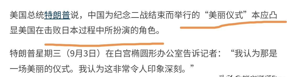 看完我们的阅兵式,美国总统特朗普出来讲话了!特朗普对于我们一个安排,有看法!9月4日,根据外媒报道,美国总统特朗普表示,我认为那是一场美丽的仪式。我认为这非常令人印象深刻。我昨晚看了演讲。中国领导人是我的朋友,但我认为昨晚的演讲中应该提到美国,因为我们给了中国非常非常大的帮助。 特朗普称,他们希望我看(阅兵式),我也确实看了。中国为纪念二战结束而举行的“美丽仪式”本应凸显美国在击败日本过程中所扮演的角色。很显然,从特朗普的表态来看,看完我们的阅兵式,特朗普声称这非常令人印象深刻,恐怕这个印象深刻最起码有两方面的意涵。其一是,特朗普对我们阅兵仪式的盛大,感到印象深刻。 其二,特朗普对于我们展现出来的武器,也感到印象深刻。特朗普声称,他们希望我看(阅兵式)。特朗普说的一点错都没有,我们非常希望美国总统看我们的阅兵式,甚至也欢迎特朗普现场看阅兵式。因为,如果美国领导人对于我们越了解,中美之间就越不会发生误判,越有可能以友好的方式和平共处。 特朗普说的没错,美国确实给我们的抗战提供了非常多的帮助,这我们完全承认。我们也看出来了,特朗普对于我们没有凸显美国在击败日本过程中所扮演的角色,有一些看法。首先,从我们的角度来看,对于美国总统公开承认中美并肩作战击败日本,这一还原历史事实的做法,我们表示高度赞赏。 但,特朗普可能没有注意到的是,其一,我们邀请了美国飞虎队后代出席相关活动。其二,我们在致辞中,对支援和帮助过中国人民抵抗侵略的外国政府和国际友人表示了衷心的感谢 。因此,我们当然对美国表示了感谢。很显然,中美应该友好相处。看完我们的阅兵式,相信美国未来会更加谨慎的处理中美关系。