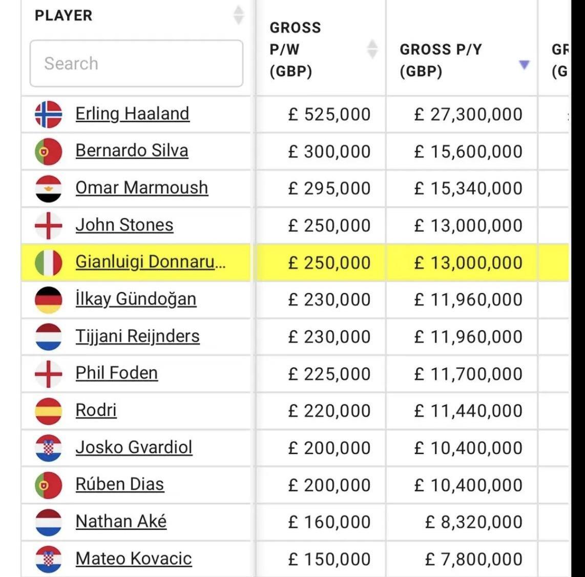 不查不知道,一查吓一跳! 多纳鲁马在曼城的周薪居然只有25万磅,仅仅排名队内第四