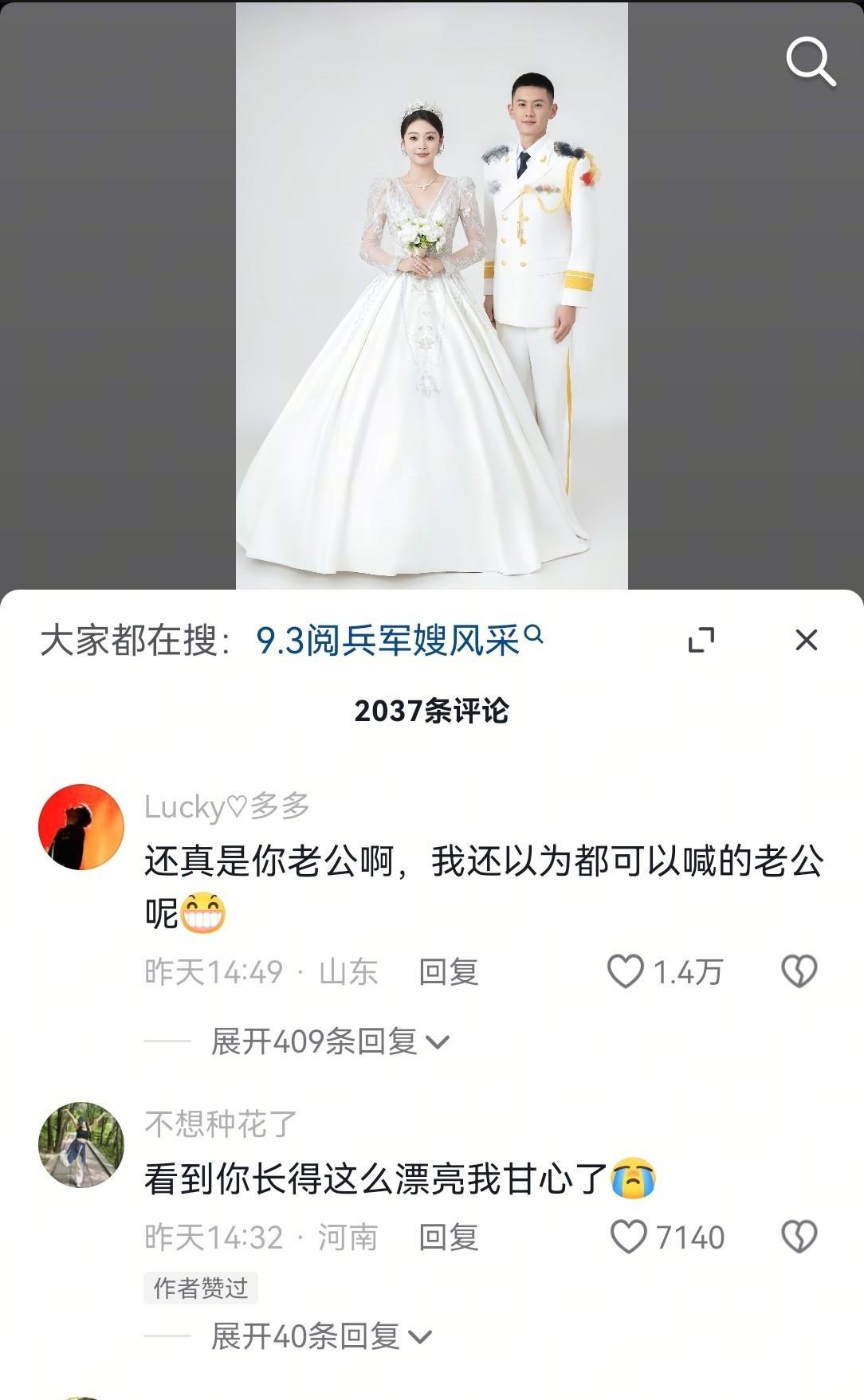 快都别惦记了,这位帅哥已有主…… 昨天阅兵图片中,国社出图出圈。其中,国社抓取到的这位小帅哥,一时成为全网最靓的仔…… 要个头有个头,要颜值有颜值,要微笑有微笑…… 正当大家都在全网呼唤兵哥哥时,兵哥哥的女主人主动亮明身份,还配上二人婚纱照…… 果然,最帅的都上交国家了。 “老公”已盖戳…… 小姐姐们自行退下吧!