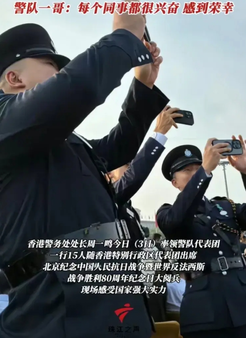 香港纪律部队集体穿制服观阅兵,抑制不住兴奋,不断拿起手机拍摄,感到荣幸 香港警察一直是亚洲顶尖警察部队,一直都是前三水平,他们每年的体测,不达标要么转做文职,要么就直接辞退了。跟港剧里演警察的感觉一样,他们随时随地衣服都挺新的感觉,无论是现实还是电影里,还有他们的体态和精神,优秀的警察队伍,不懒散