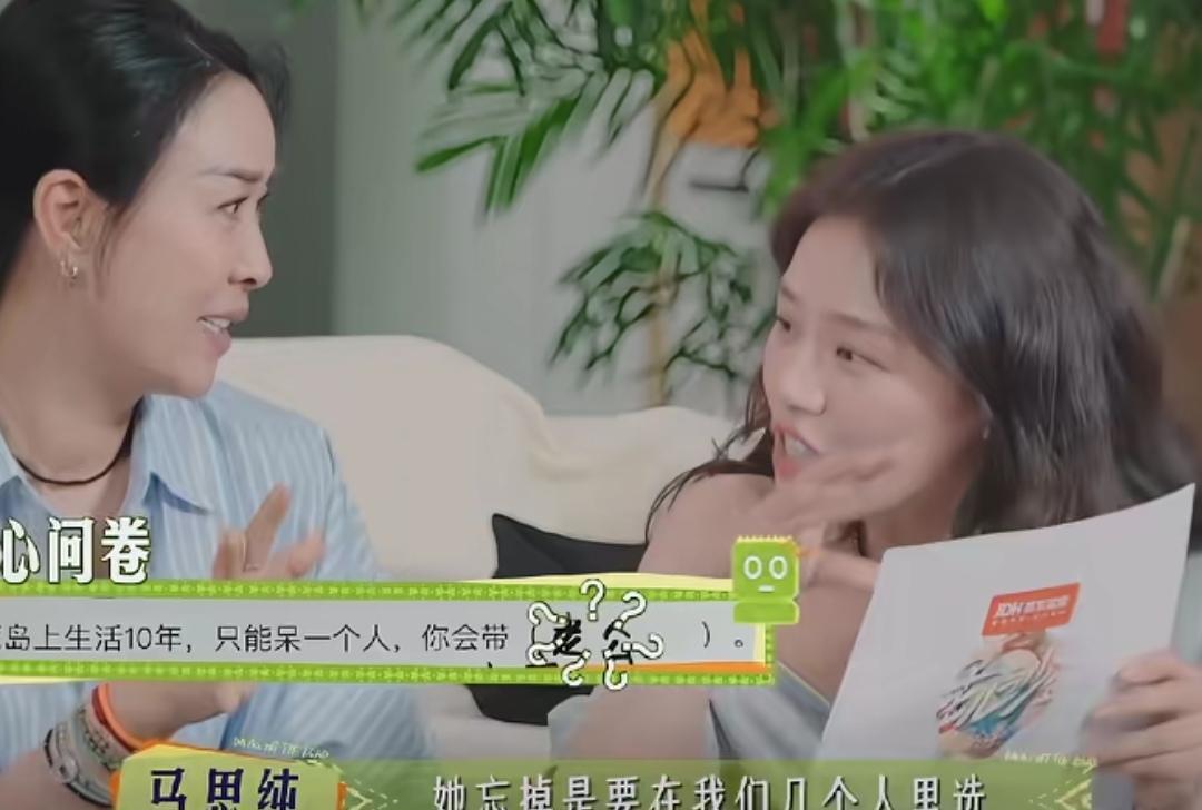 那英填问卷在荒岛上生活十年,她要带老公去,结果她没弄清楚是要在花少团里选,马思纯:“她填她老公”,那英:“你不带老公去带谁去”,她把导演也弄懵了,导演以为她说的老龚是龚俊 那英这脑回路也是绝了,没搞清楚问题,直接填自己的老公,后来导演提醒才知道自己填错了 马思纯在那英旁边笑的好开心啊,看到她慢慢的让自己的情绪得到释放,为她感到开心