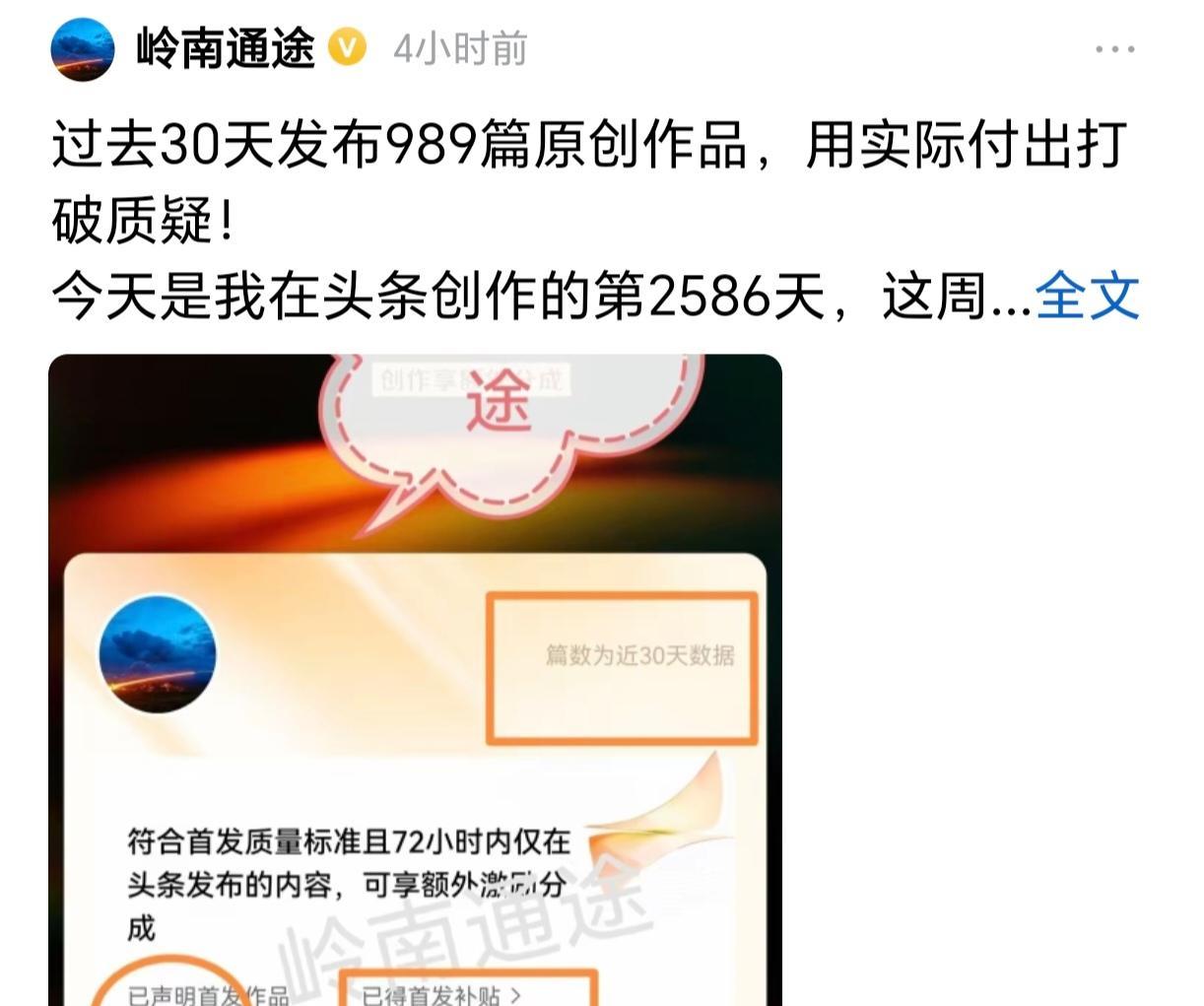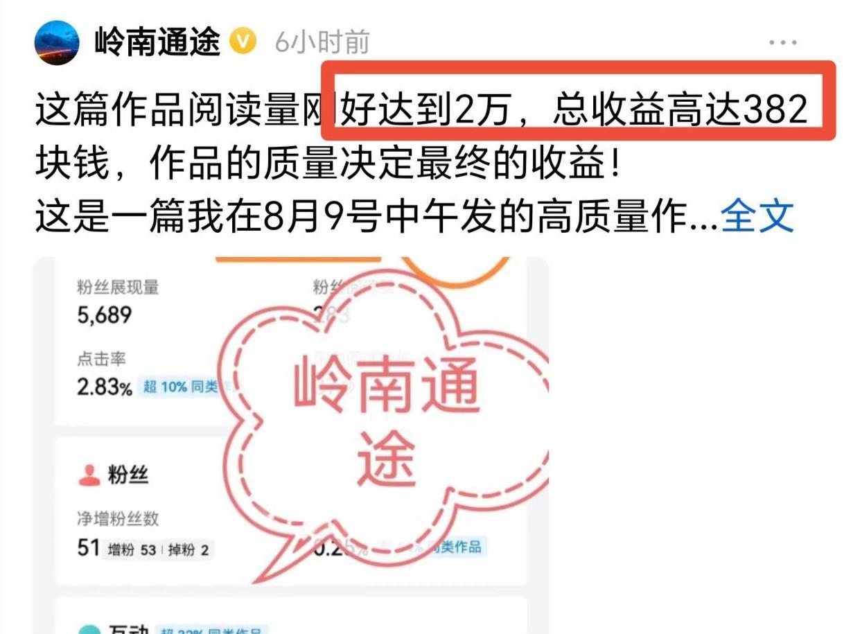 岭南通途每天五六百块钱的收益是真的吗? 从我个人的认知来看,有点不真实! 而岭南通徐他的收益都是高单价支撑起来的,为什么说不真实,因为单价高得有点离谱。 他分享的收益情况,基本都是两三万的阅读量就有三四百块钱,意味着每千次阅读高到10块钱以上的单价了。 我看网友每次问他怎么做到这么高收入,他的回应千篇一律都是”坚持原创“,但看他的内容基本来来回回都是一个意思的分享,看多了反而会有一种视觉疲劳的感觉。 而且有一点我觉得很奇怪,他在9月4日晒出来一张首发补贴的收益图去打破质疑,近30日内他已声明的首发作品是989篇,补贴收益是9272.45元。 我去看了下自己的,近30天发了113篇,首发补贴显示的是全部收益23723.63元,不知道是我的出错了,还是每个人的显示都不一样。 但他的收益真是高到离谱,也令人羡慕!