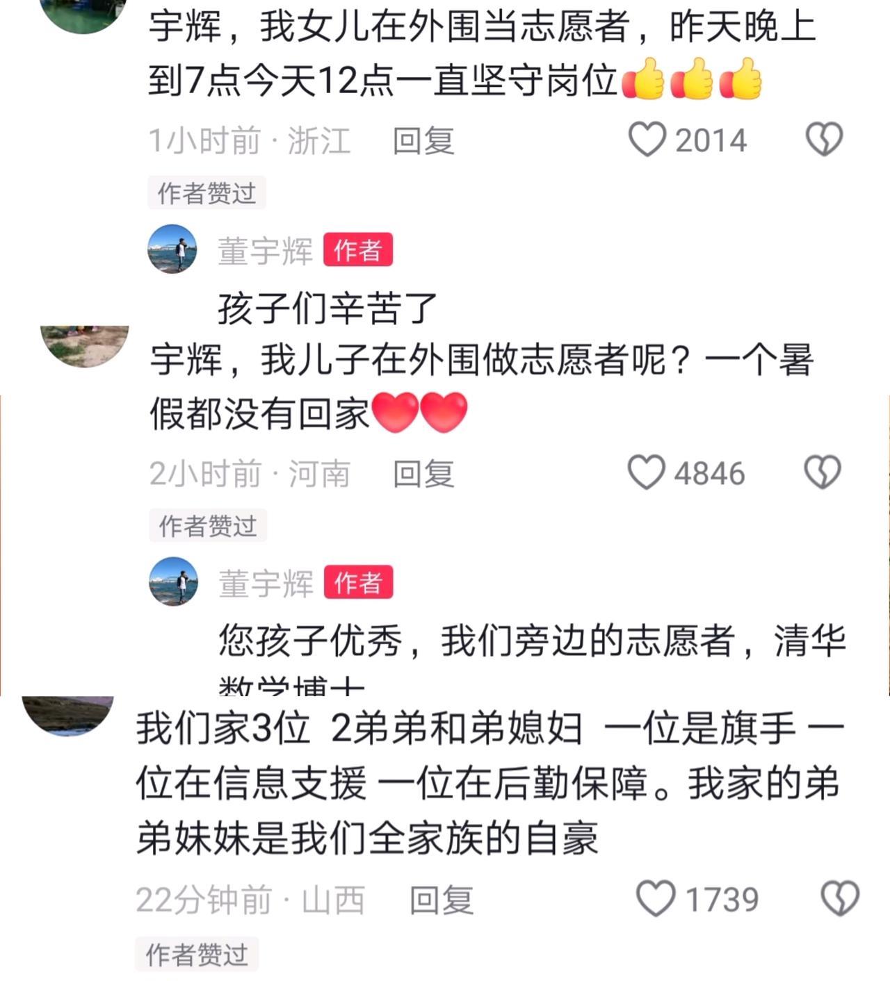难怪与辉同行招聘时,退伍军人优先,还适当降低了要求,当看到董宇辉回复的评论,才明白他的用意。 今天董宇辉受邀阅兵观礼,在现场兴奋地连拍了好多视频,并和网友分享连更五条,直接上了热榜。 许多朋友立马赶来,纷纷留言。 有几位家长非常自豪,忍不住和大家分享:“我的女儿在外围当志愿者,一直坚守岗位十几个小时。” “我的儿子也在外围当志愿者,一个暑假都没回家。” 董宇辉看了,马上点赞,孩子们辛苦啦,您的孩子非常优秀。 还有一位朋友说,这次阅兵他们家有三位,分别是旗手、信息支援、后勤保障。 董宇辉马上回复,向您的家人致敬! 大家看到了吧,为什么他们招聘,退伍军人会适当放宽,他们好几位幕后运营曾经都当过兵,现在在与辉同行上班,很多人都羡慕。 #董宇辉#