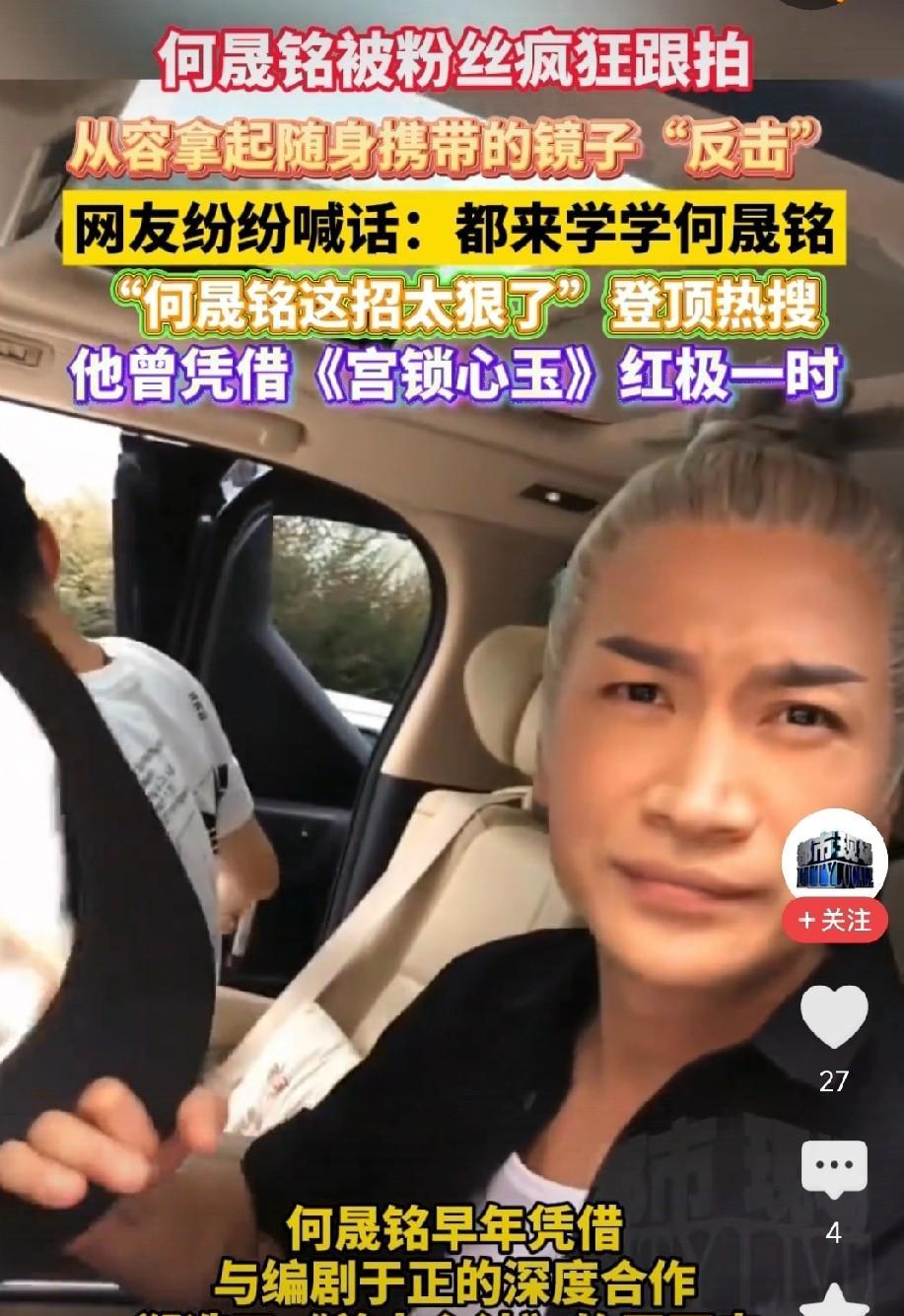 何晟铭还怪有趣哩。被私生饭和代拍围追堵截,是大多数明星讨厌却又无可奈何的事情。因为根本不知道要怎样应对。以前,有明星被气急了,去夺这些人的手机,结果就是被各种攻击。 但是,何晟铭就厉害了。他就用一招,轻松应对,甚至让那些拍他的人瞬间破防了。 原来,何晟铭在被私生饭追拍的时候,不慌不忙的拿出了一面镜子。他把镜子对准了那些人。哈哈,这下子好笑了,这些拍他的人,把自己都拍进去了。这样的反击有效又不伤人,以后,会不会有更多的明星效仿呢?