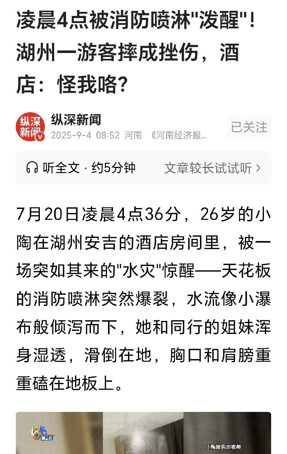 湖州安吉,一女子住酒店,凌晨4点,天花板消防喷淋暴裂,水倾盆而下,女子滑倒,撞