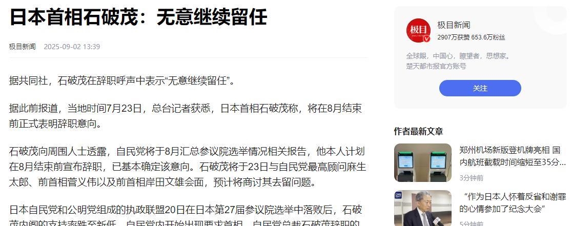 九三大阅兵刚结束,日本立马慌了神!口风180度大转弯,石破茂还在关键节点暗示辞职,这哪是巧合?怕不是早料到扛不住中国的气场! 中国九三阅兵刚结束,日本就炸出大新闻 —— 首相石破茂居然暗示要辞职! 之前还硬撑着搞军事扩张,现在态度 180 度大转弯,连内阁官房长官林芳正回应都遮遮掩掩,明眼人都懂:他们是被中国这波阅兵彻底镇住了,再硬扛绝对没好果子吃! 石破茂这时候认怂,太出人意料了,以前日本首相再难都硬撑,这次为啥服软? 说到底是看清了局势:中国阅兵亮的不是花架子,是实打实的硬实力,明着告诉全世界 “谁再走军国主义老路,中国绝不答应”! 石破茂心里门儿清,日本再扩军跟中国对着干,只会把自己拖进火坑。他所谓的 “激流勇退”,就是怕扛不住压力想提前脱身,纯属被吓怕了! 再看林芳正,嘴上喊 “不重蹈战争覆辙” 装和平,可日本这些年干的事大家都看在眼里:军费飙涨、让美军部署中导、高官老去参拜靖国神社,哪点像要和平? 可中国阅兵一搞,26 国领导人来捧场,连印尼总统放着国内骚乱都赶来,这明摆着全世界认中国的理、服中国的实力!林芳正再想洗白也没人信,只能蔫着不敢嚣张。 日本这改变根本不是良心发现,是被中国实力和国际态度双重打脸后的无奈,以前靠美国撑腰在亚太搞小动作,现在才看清:美国靠不住,更多国家认中国的和平发展。 再瞎折腾只会越来越孤立,还怕中国让他们为过去的侵略买单 —— 毕竟真要硬碰硬,日本根本不是对手! 说实在的,日本要是真能弃军国主义,对亚太和平是好事。可就怕他们暂时服软,风头过了又故态复萌。 但现在形势不一样了,中国实力在这,国际社会站正义这边,日本再瞎折腾只会自讨苦吃。 石破茂要是真辞职,新首相得想明白:跟中国对着干没出路,只有正视历史、搞和平发展才是唯一选择。 中国阅兵不光纪念历史,更是给日本划了红线 —— 再越界就别怪中国不客气!希望日本真吸取教训,别再干后悔事,不然早晚在历史里再摔大跟头!