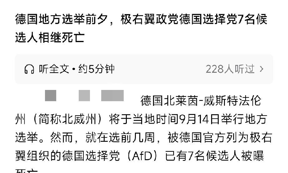 一个党派,两周死七名候选人,说这是巧合? 自8月21日开始,在不到两周时间里,准备参加德国北威州选举的德国极右翼政党德国选择党连续七名候选人去世。 说起德国选择党,可能大家没怎么听过,但是在今年2月的德国联邦大选中,德国选择党以20.8%的得票率排名第二,其领导人就是以强硬著称的“女强人”魏德尔,她曾将德国政府形容为“那些想要毁掉这个国家的疯子”。 德国选择党之所以被打上极右翼的标签,是因为他们试图淡化纳粹德国历史罪行的言论,认为德国人不应该永远为纳粹的罪行背负愧疚感,主张摆脱这种“历史包袱”。 他们鼓吹“德意志民族”优先,,反对“全球化主义”和“多元文化主义”。 马斯克也一直支持德国选择党。他曾表示:“德国要么投给德国选择党,要么就完蛋。” 不过再怎么说,两周死七名候选人,这可能吗?