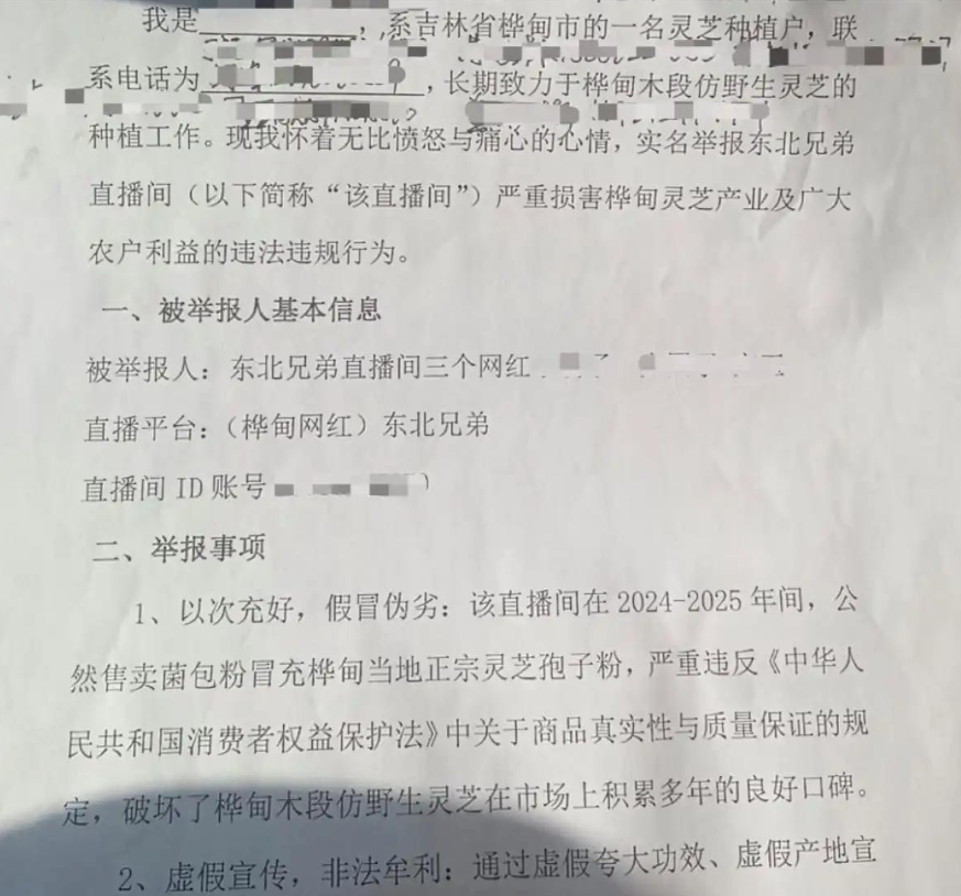 然而,纸终究包不住火。从8月开始,就有人陆续在网上举报东北兄弟虚假宣传、摆拍带货。当地种植户透露,东北兄弟在直播间声称在桦甸有200个灵芝大棚,还帮周边农户销售孢子粉,可实际上根本没收购本地农户的产品。他们这是“挂羊头卖狗肉”,说卖的是桦甸孢子粉,实际发货给消费者的却是外地菌包粉。因为外地粉利润更高,卖本地粉一单挣30 - 50元,卖外地粉一单至少能挣100元。在利润和良心面前,东北兄弟选择了前者。