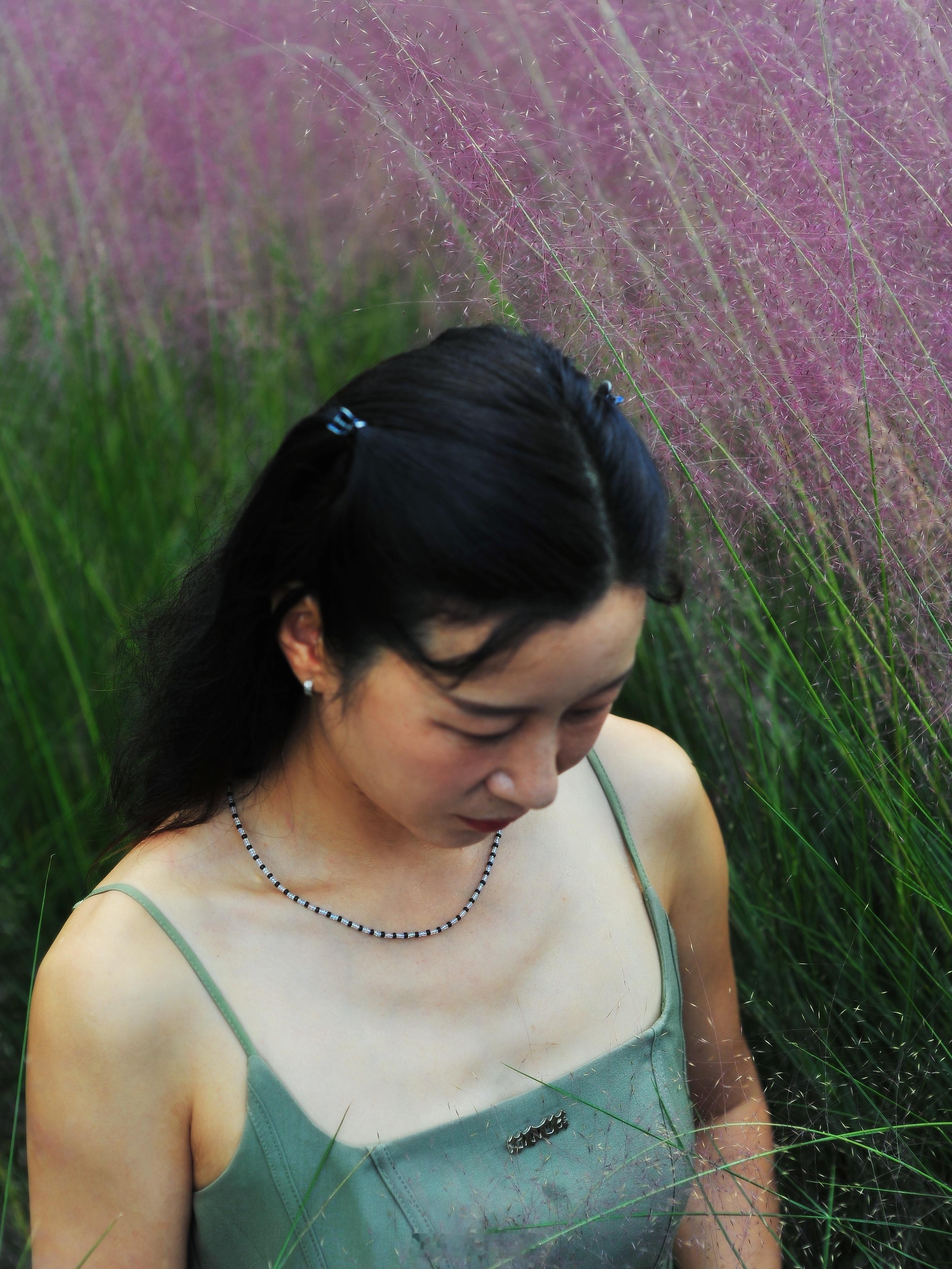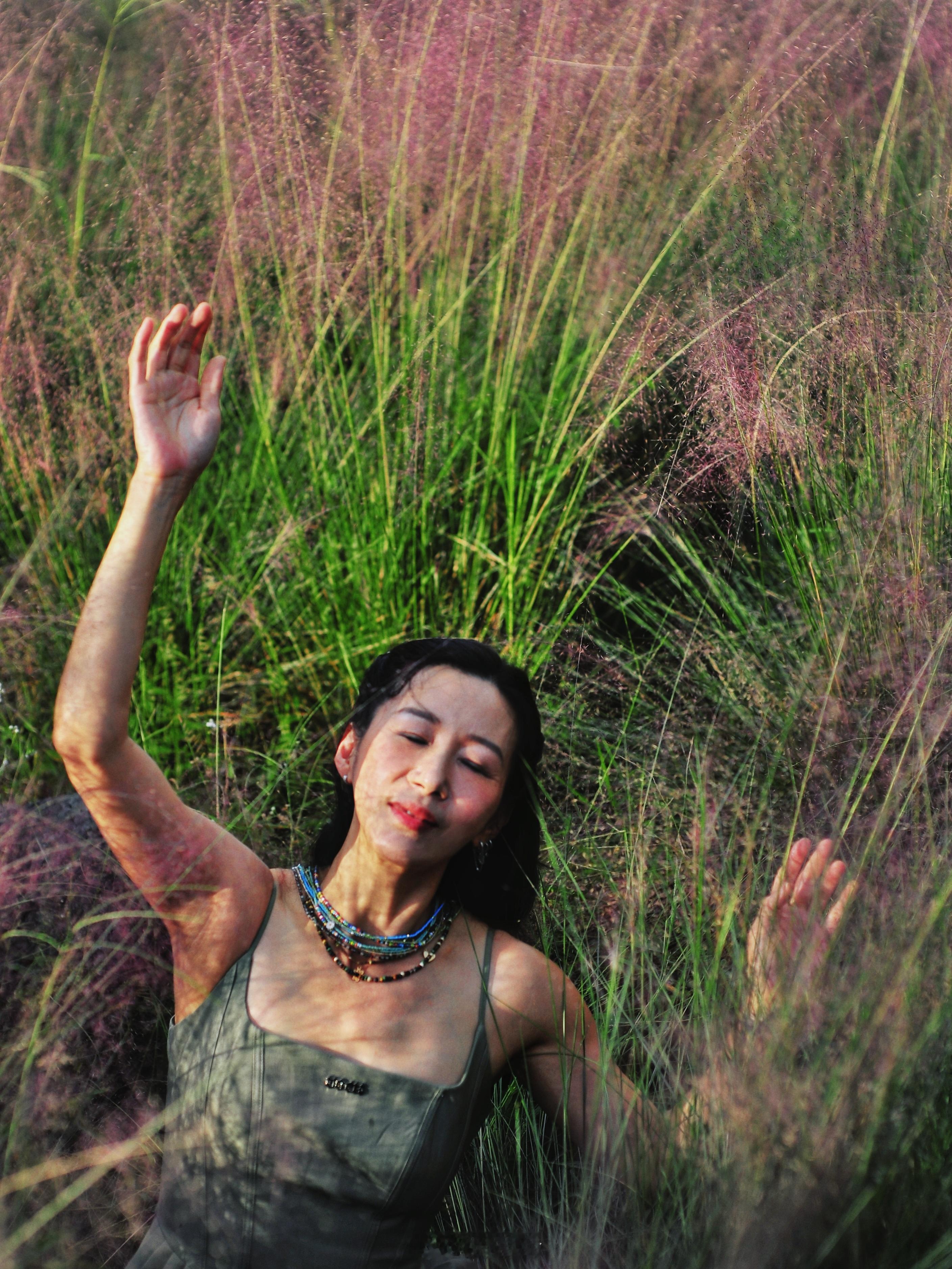 在粉黛乱子草的柔波里躺成一幅画,脖颈间是闺蜜(小红书时尚首饰白水晶好运 粘粘有余 niannianyvue)亲手编织的能量宇宙——虎眼石的锋芒、黑曜石的深邃、白水晶的澄澈,还有蓝晶石的幽秘,颗颗串联成我的光之铠甲。