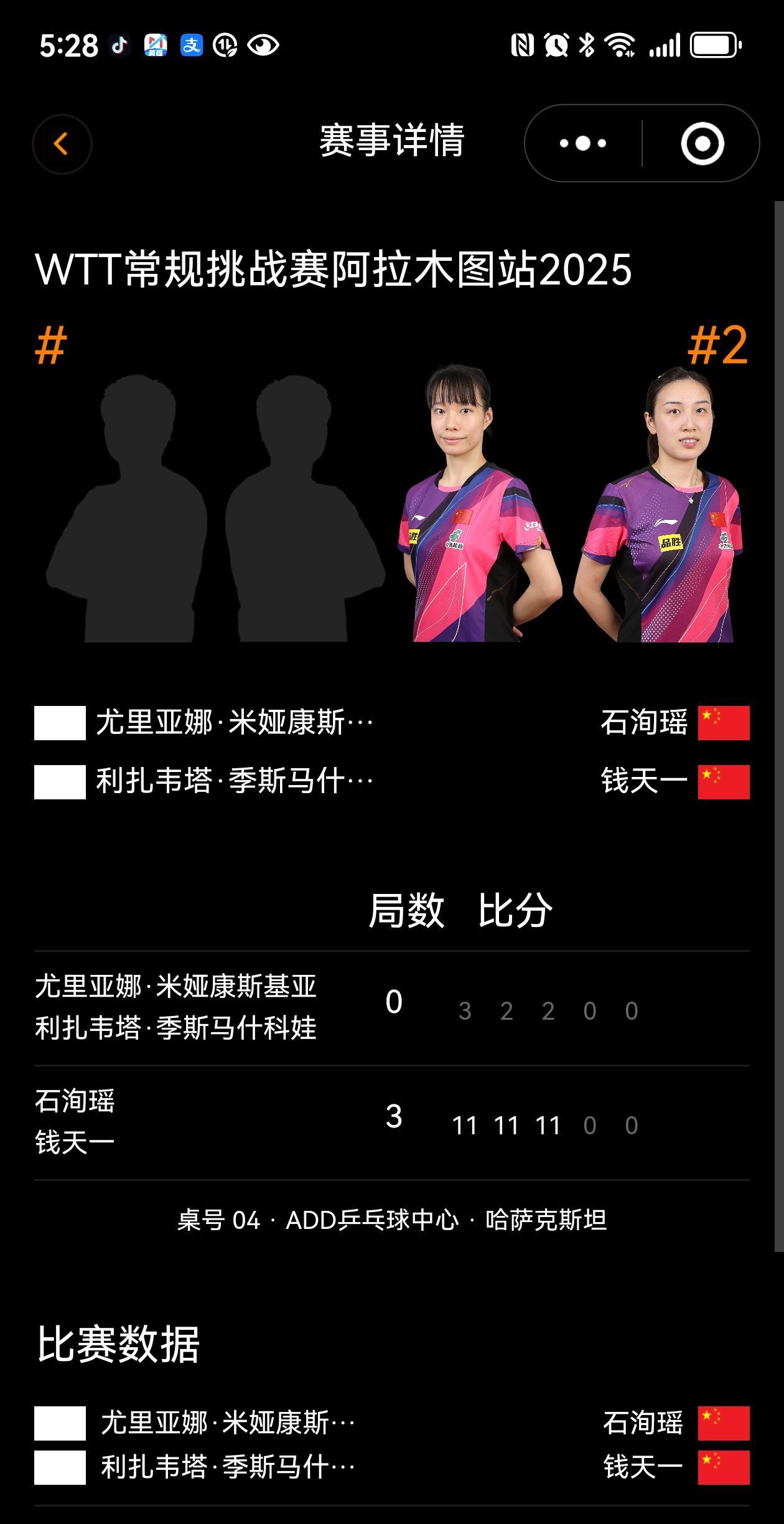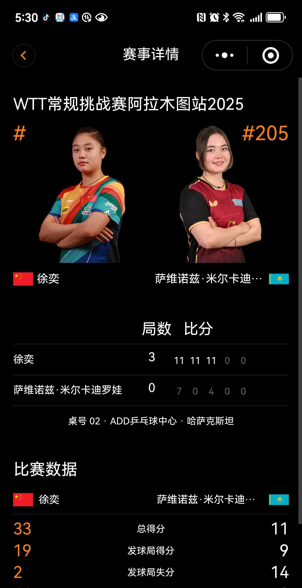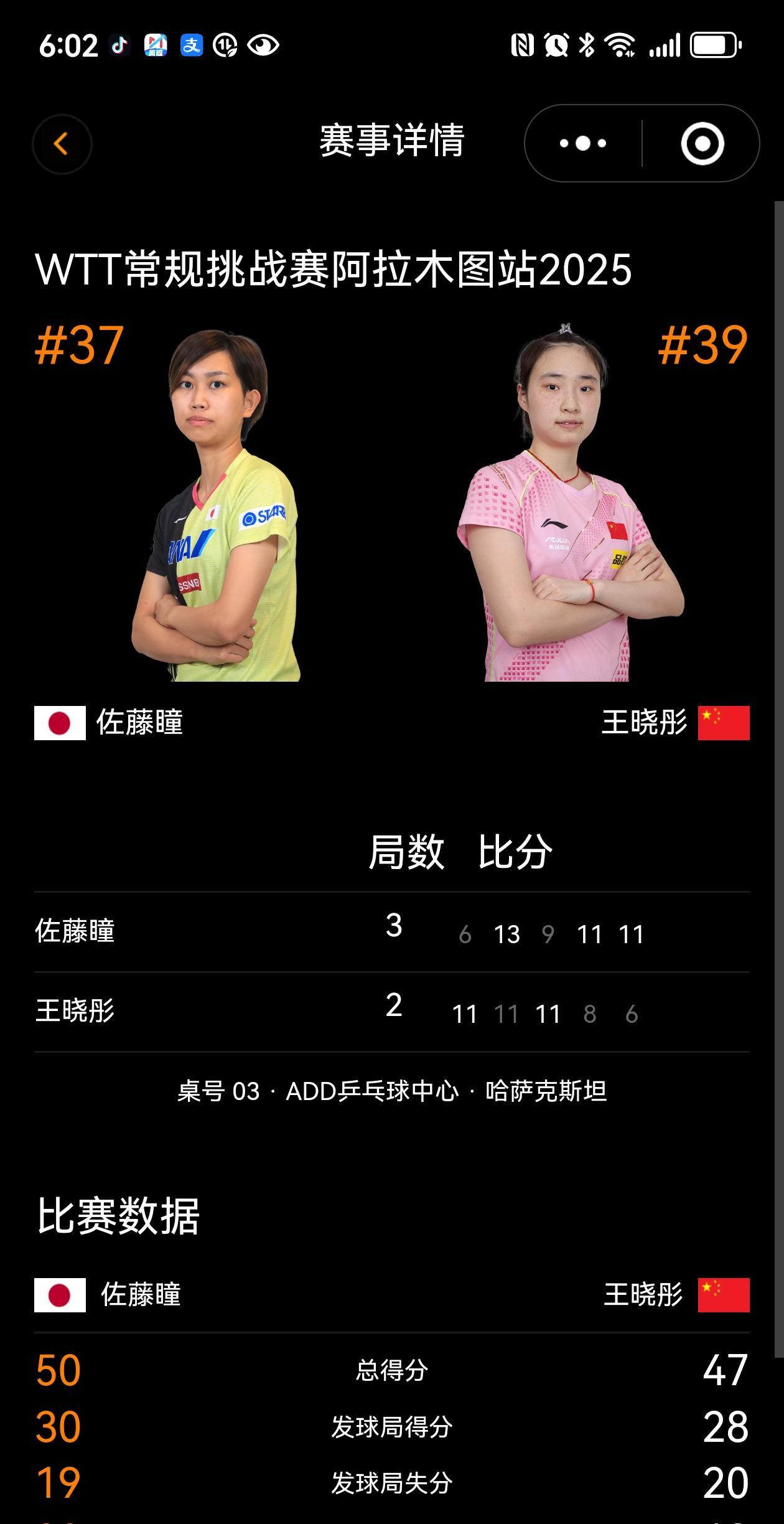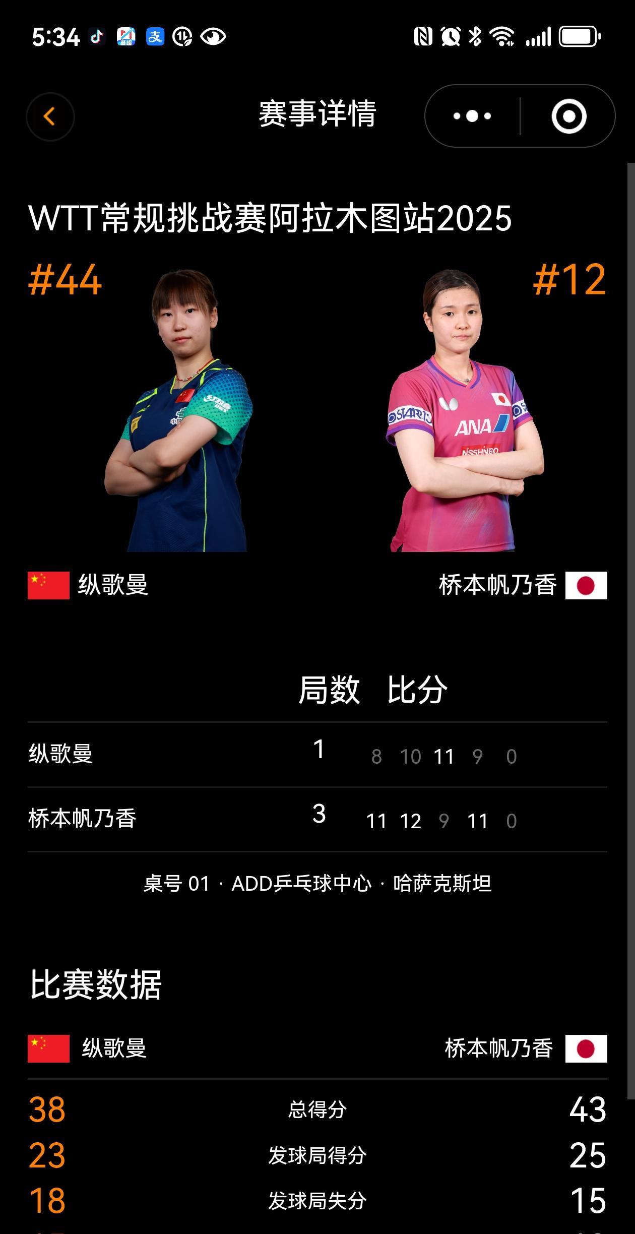 WTT常挑阿拉木图站2025(9.2-7),9.4午场,正赛第一天,开门红:混双国乒两对组合晋级八强;双打三对组合,石洵瑶/钱天一首站晋级八强。何卓佳、徐奕、覃予萱零封对手晋级16强;周启豪、预赛晋级的陈俊菘淘汰对手晋级16强。没能晋级的两位,值得点赞,打的非常激烈精彩,惜败!王晓彤2:3日本削球手佐藤瞳,因为比赛时间太长,体能不强! 纵歌曼(小粽子)1:3都是每局领先情况下惜败桥本帆乃香,输球原因主要是因为前两局徐辉教练在场外指导王晓彤,小粽子这边场外无教练,第二局小粽子10:6领先,10:8叫停(这时教练还在王晓彤那边),太遗憾没能拿下。第三局挽回一局。#2025wtt#