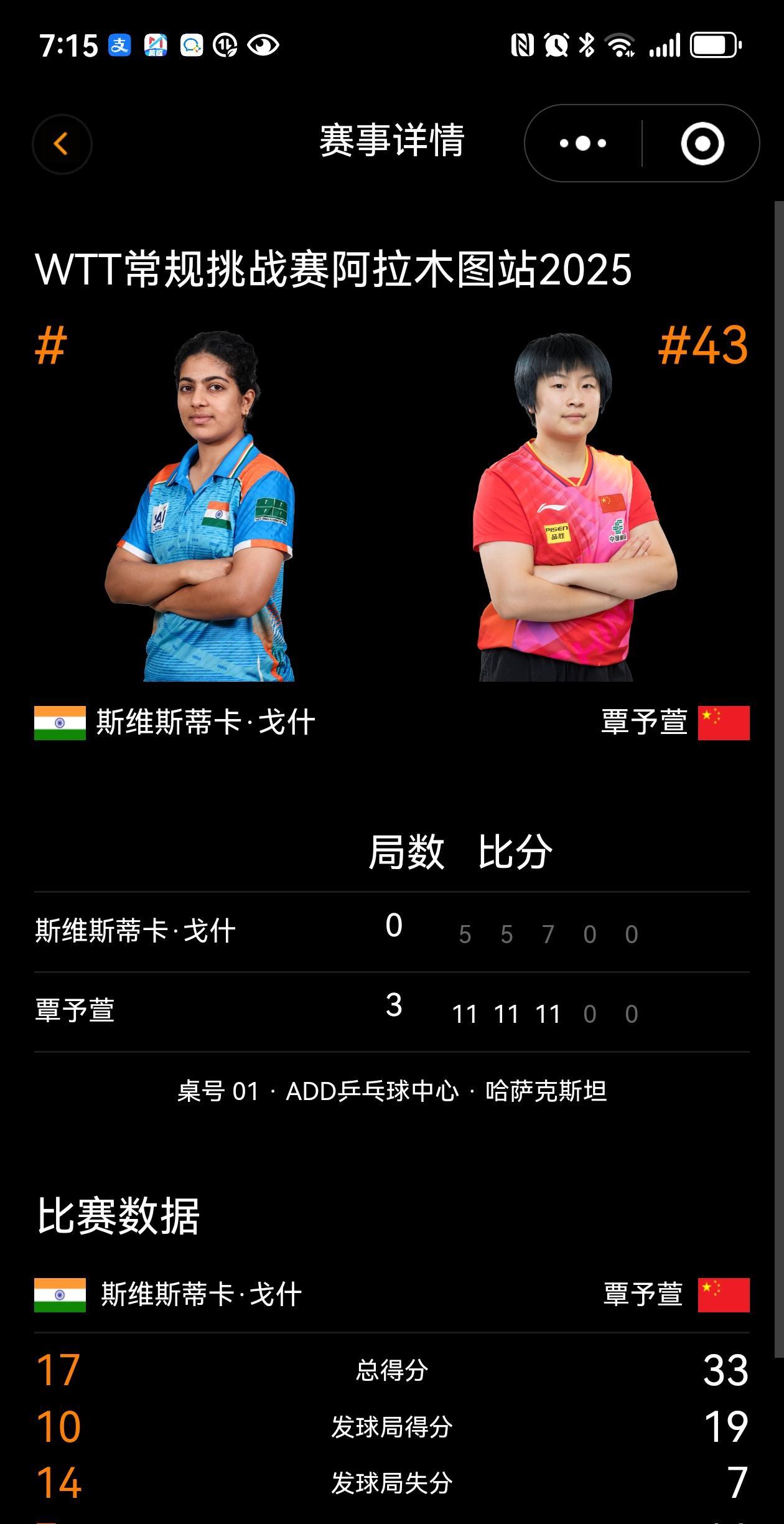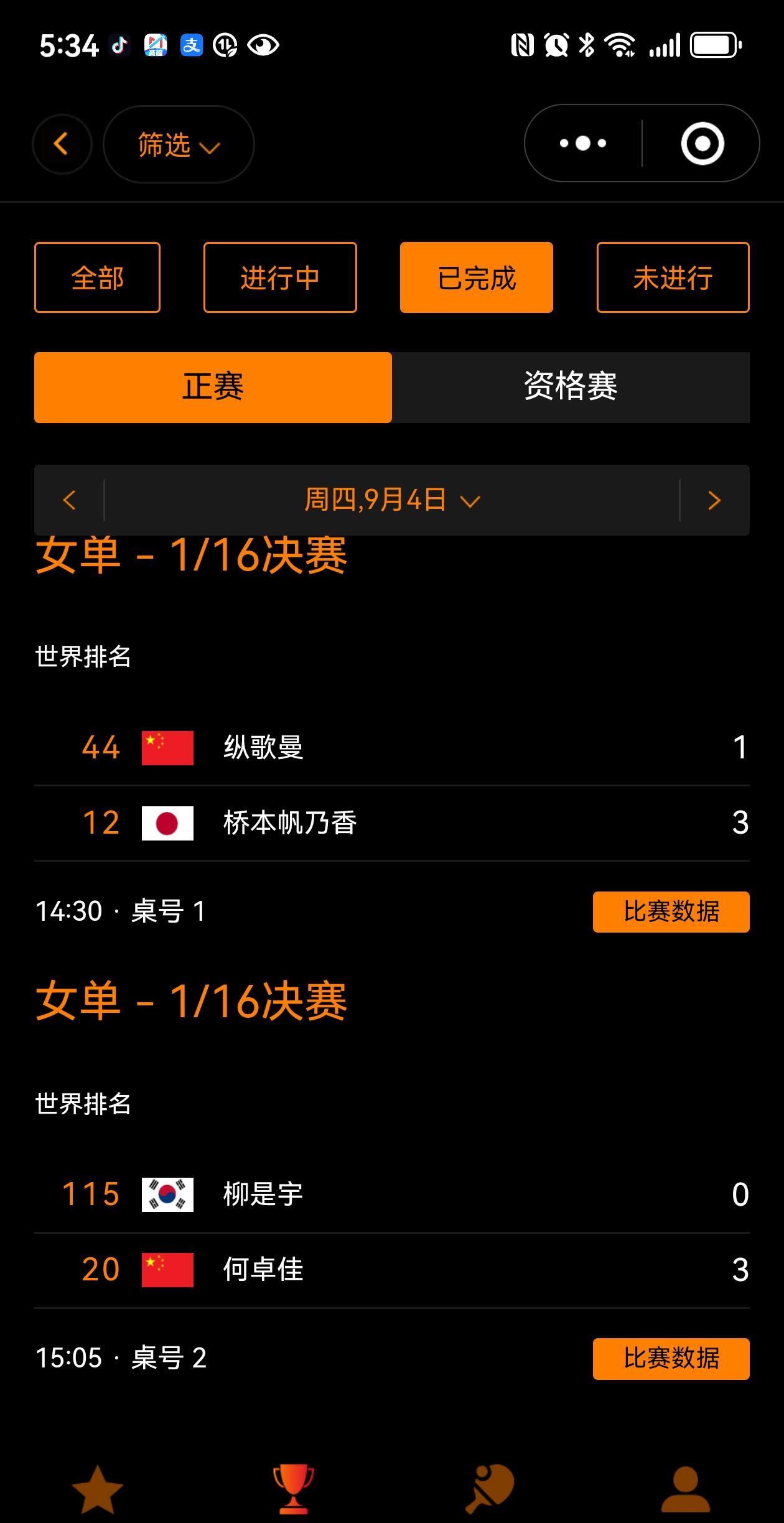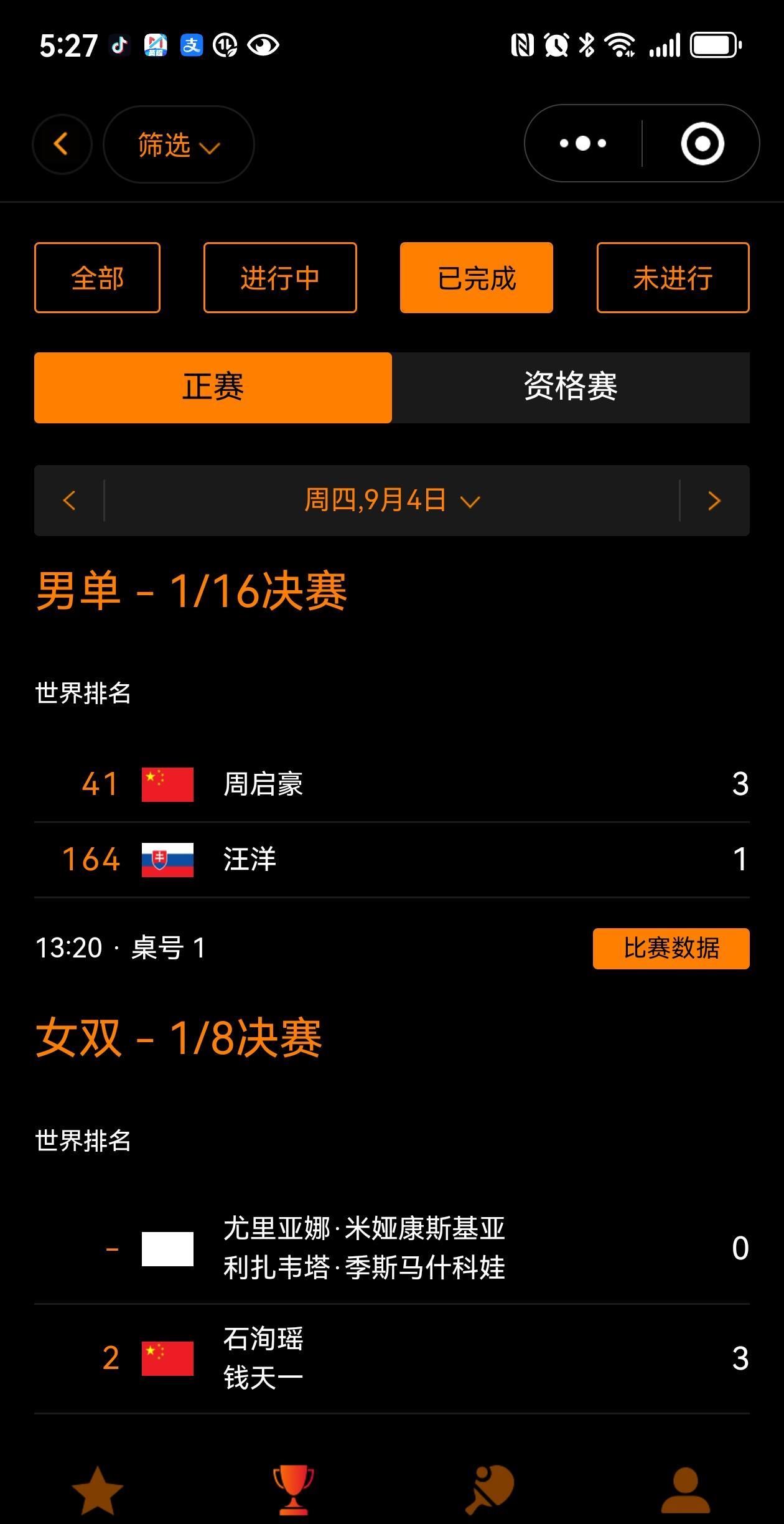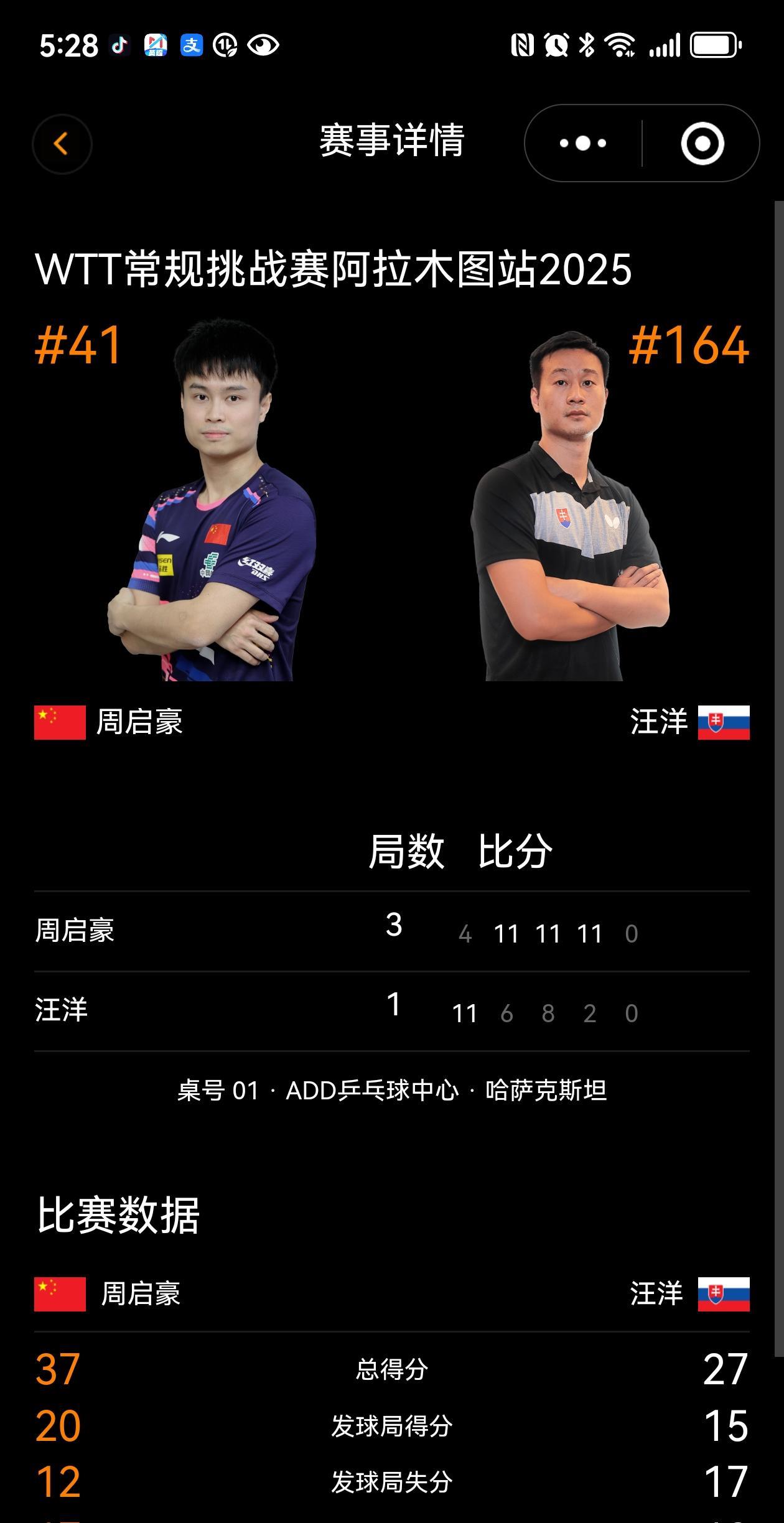 WTT常挑阿拉木图站2025(9.2-7),9.4午场,正赛第一天,开门红:混双国乒两对组合晋级八强;双打三对组合,石洵瑶/钱天一首站晋级八强。何卓佳、徐奕、覃予萱零封对手晋级16强;周启豪、预赛晋级的陈俊菘淘汰对手晋级16强。没能晋级的两位,值得点赞,打的非常激烈精彩,惜败!王晓彤2:3日本削球手佐藤瞳,因为比赛时间太长,体能不强! 纵歌曼(小粽子)1:3都是每局领先情况下惜败桥本帆乃香,输球原因主要是因为前两局徐辉教练在场外指导王晓彤,小粽子这边场外无教练,第二局小粽子10:6领先,10:8叫停(这时教练还在王晓彤那边),太遗憾没能拿下。第三局挽回一局。#2025wtt#
