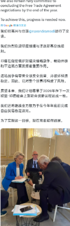 欧盟委员会主席冯德莱恩昨晚(北京时间9月4日)写道:“我们很高兴与印度总理莫迪进行了交谈。我们热烈欢迎印度继续与泽连斯基总统接触。印度在促使俄罗斯结束侵略战争、帮助开辟和平道路方面发挥着重要作用。 这场战争将带来全球安全后果,并破坏经济稳定。因此,它对整个世界都构成了风险。 展望未来,我们计划最早于2026年在下一次欧盟-印度峰会上就联合战略议程达成一致。 我们还将继续全力致力于在今年年底前完成自由贸易协定谈判。为了实现这一目标,现在需要取得进展。”
