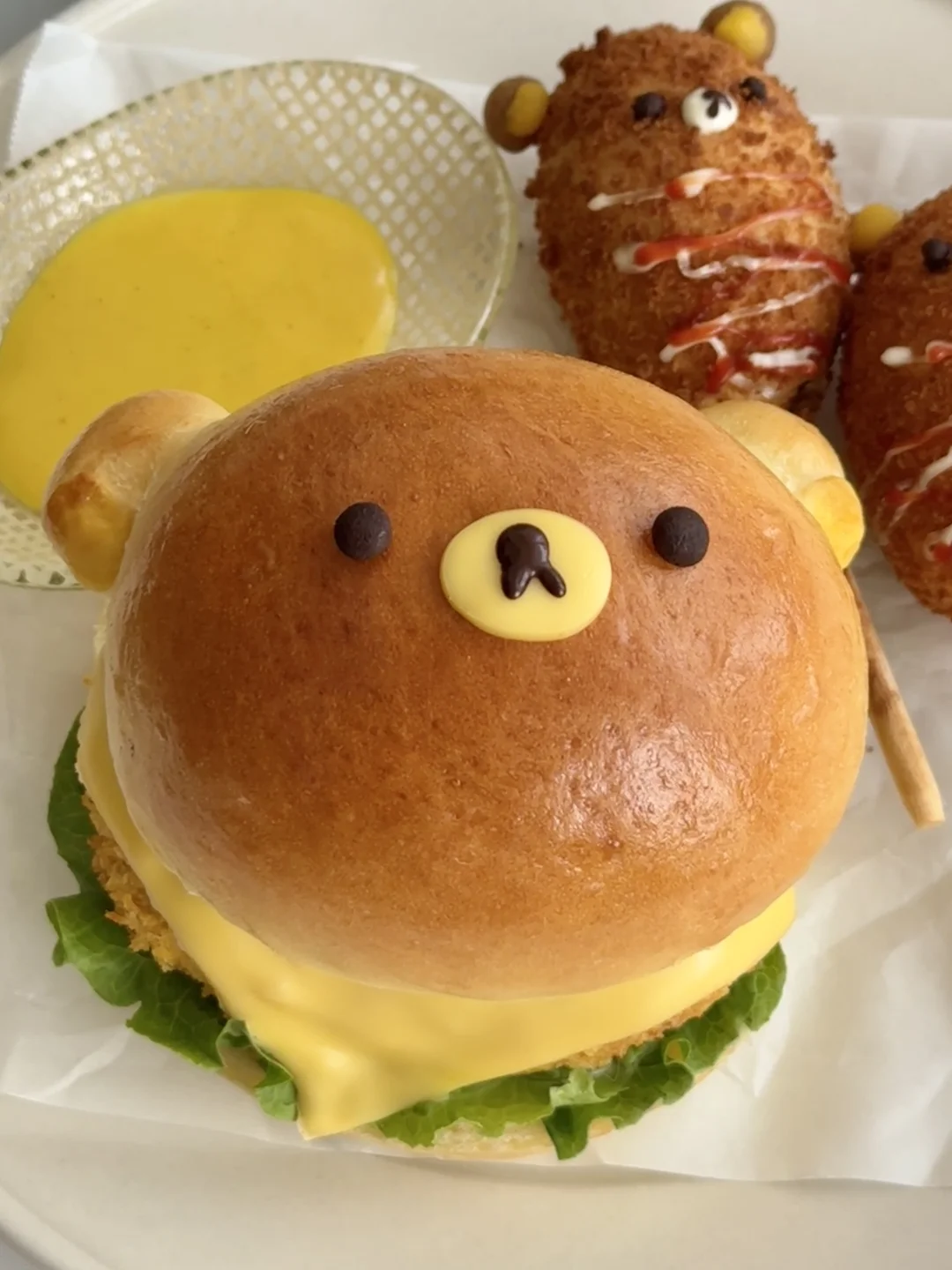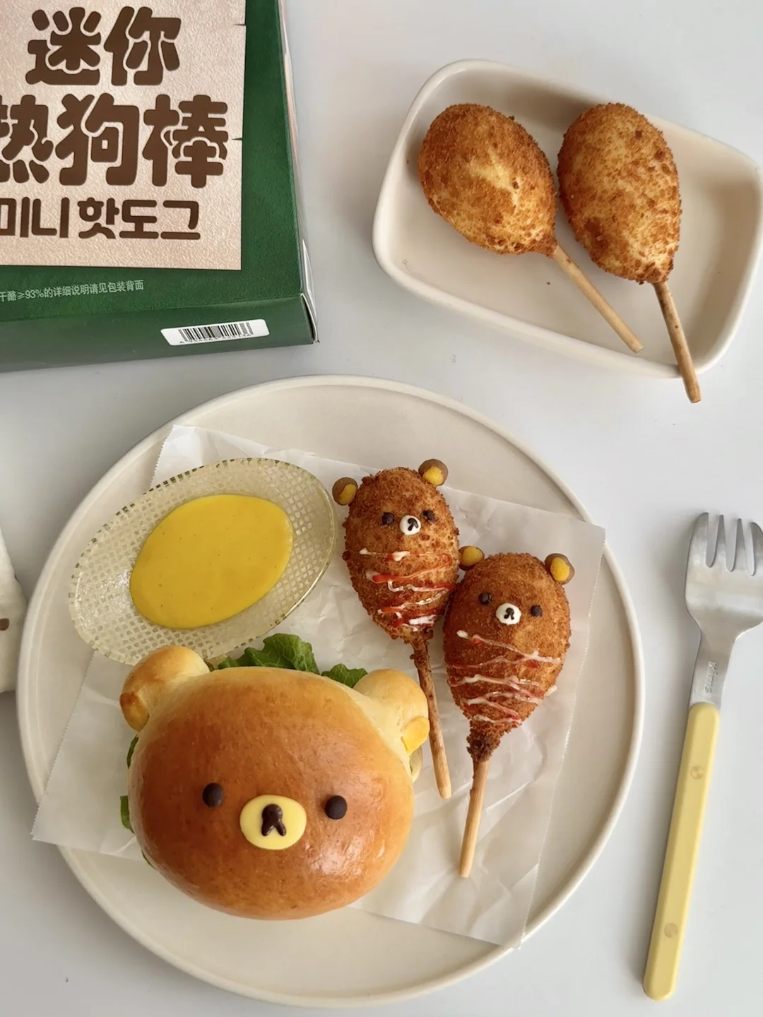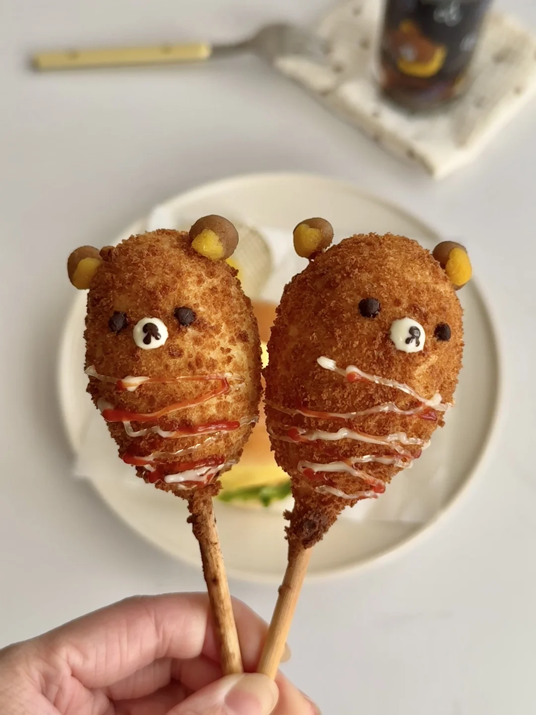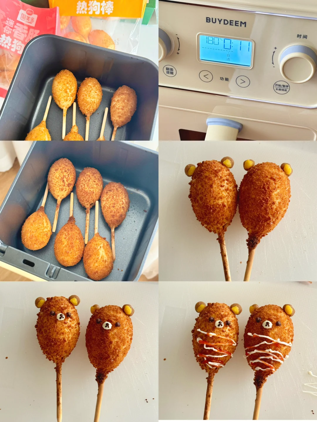 2️⃣将热狗棒放入空气炸锅中180度10分钟,出炉后用土豆泥捏出轻松熊的耳朵和鼻子,表面挤上沙拉酱和番茄酱