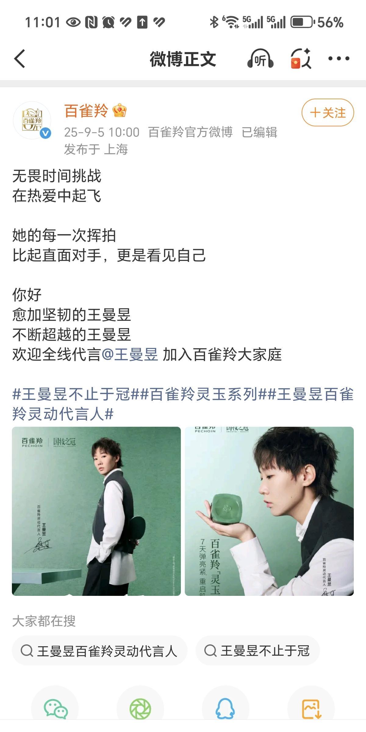 09月05日,来啦,来啦,王曼昱再斩获一个代言,恭喜王曼昱喜提百雀羚品牌灵动代言