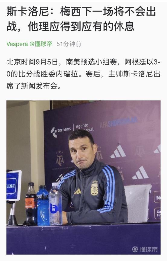 今天的主场比赛过后,斯卡洛尼宣布梅西将不会随队前往厄瓜多尔。梅西要充分休整,暂别