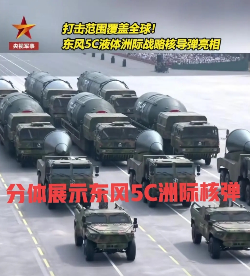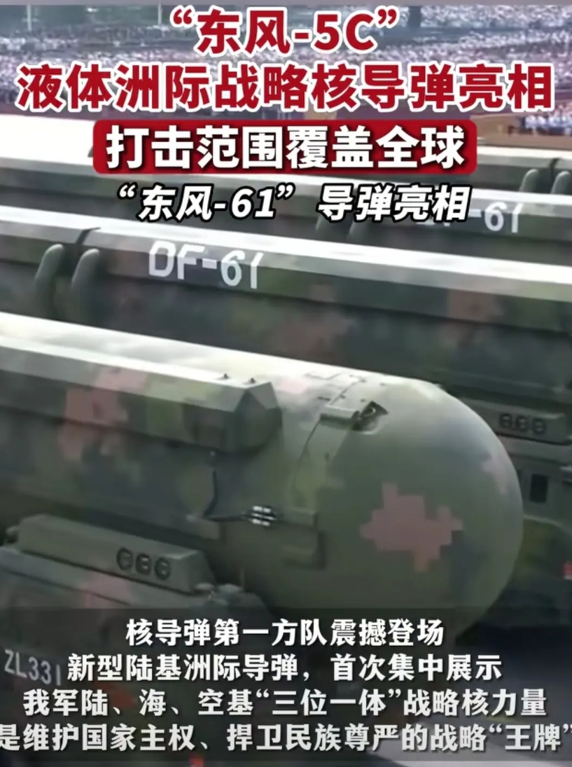 这次阅兵式真的吓到我了!以前都不拉弹头出来的。这次展示了东风61和东风5C核弹头是我万万没想到的。 这两款大杀器主打一个覆盖全球,威慑全球。 科普一下:DF—5C是分体运载的,所以很多观众都没看懂,心里想问:为啥看到的就是一个圆柱体和一个大胖墩外加一个“核弹头”? 所以你们知道为什么分成3段吗?因为合并在一起会很吓人。而且也没有这么大的车来运载。 其实东风5C是发射井用的,这次单纯是拉出来亮亮。