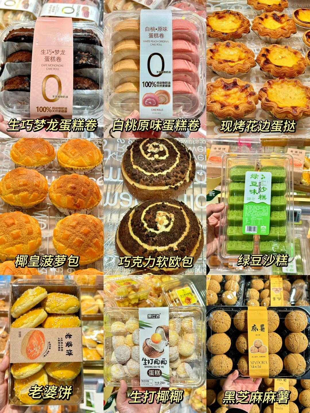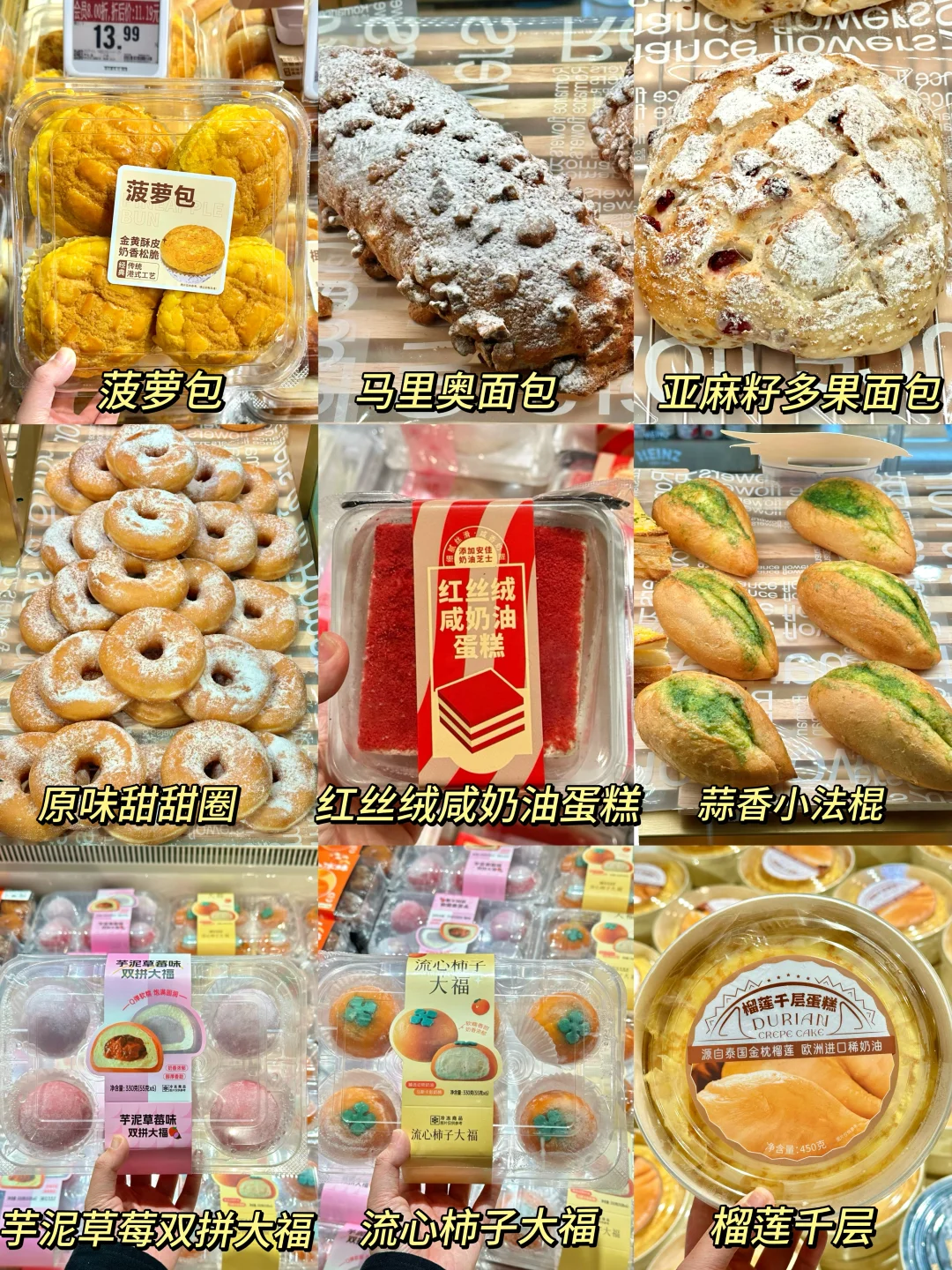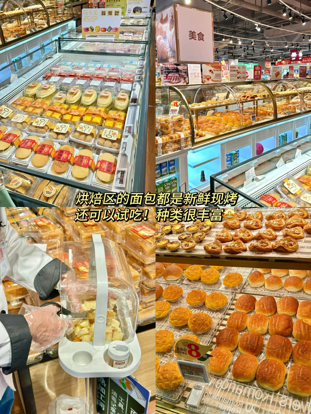 ✅烘培区:焕新升级后品种丰富了很多!马里奥面包一定要买,里面满满干果馅料,简直就是咸甜永动机!还有超火的榴莲千层、流心柿子大福、现烤花边蛋挞、生巧梦龙蛋糕卷、生打椰椰、蒜香小法棍等等都很值得试试!