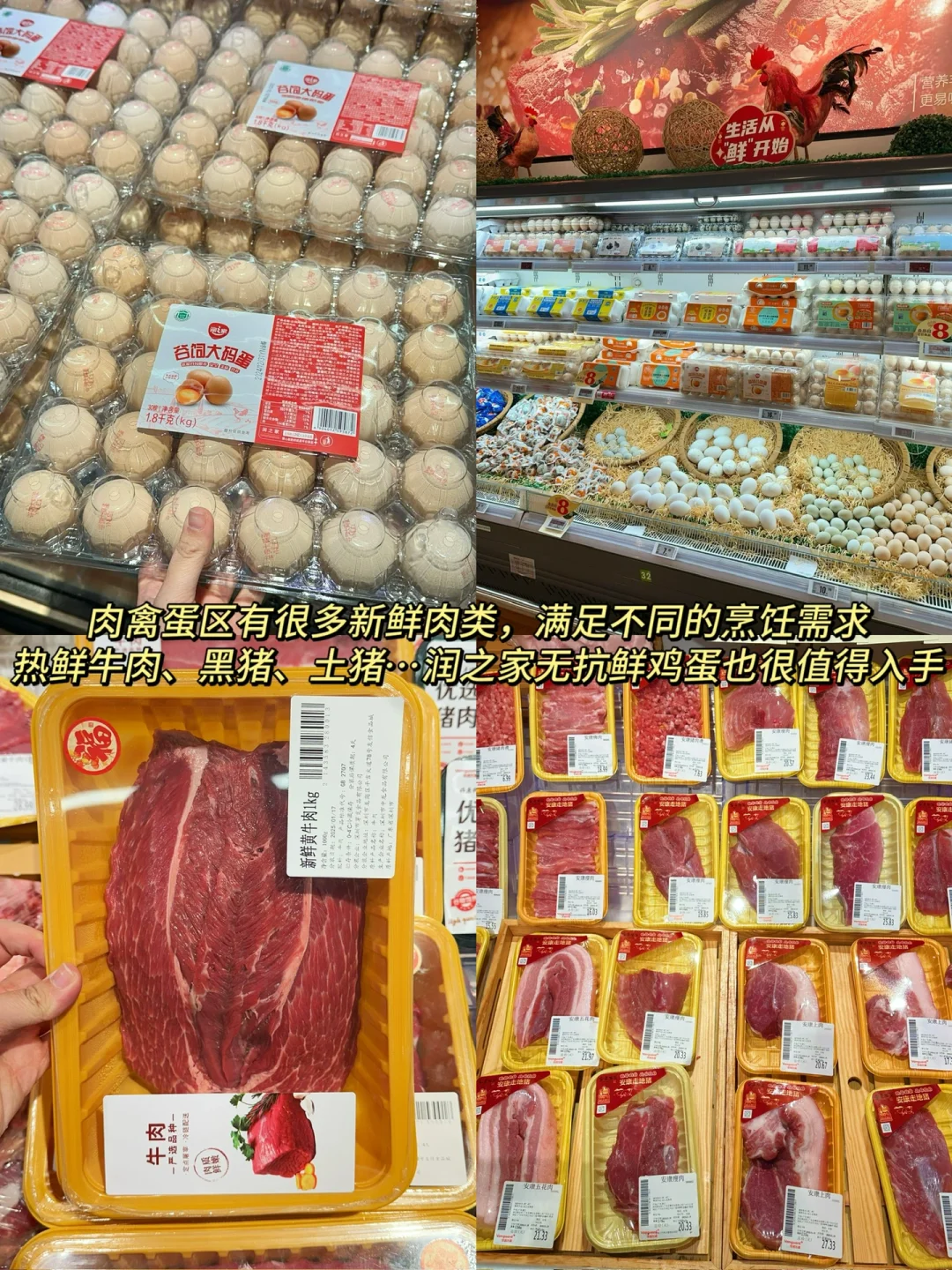 ✅肉禽蛋区:有很多新鲜肉类,满足不同的烹饪需求像热鲜牛肉、黑猪、土猪还有无抗鲜鸡蛋也很值得入手!