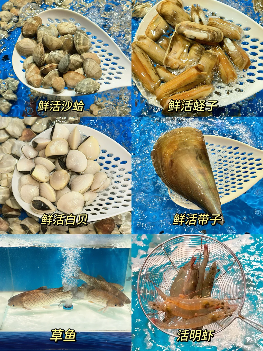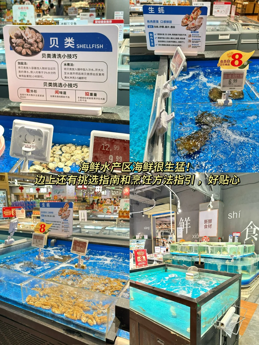 ✅海鲜水产区:海鲜种类多,可以活鲜到家,边上还有挑选指南和烹饪方法指引,好贴心