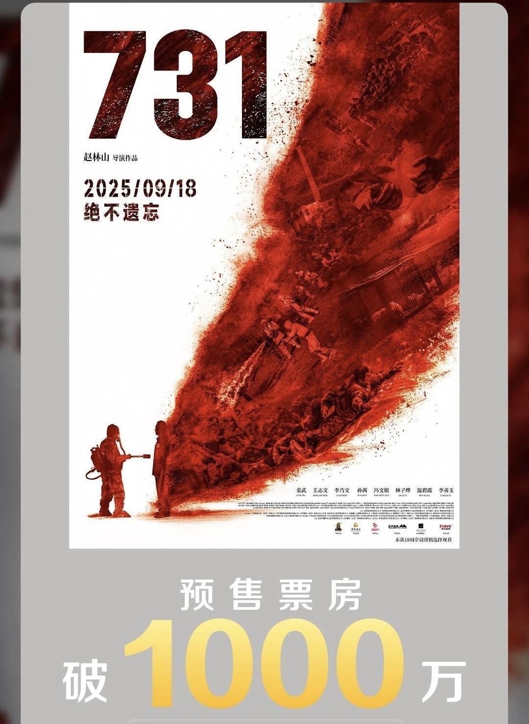 阅兵结束了,该《731》电影发力了!截至9月5日10时52分影片《731》预售总票房突破1000万! 该片讲述了中国人民抗日战争胜利前夕,侵华日军为了扭转战局在哈尔滨平房区开展细菌战研究,屠戮百姓进行人体实验的故事。 9月3日的抗战胜利80周年阅兵成功的举行了,相信全世界都看到了中国在阅兵上展现中国军队的军容 军纪 军力 ,中国已经成为世界上三位一体的核战略打击国家,中国的天空 海上 海底 陆上的展力,以超越基甚至领先世界的成就,让世界知道,中国是一个爱好和平的国家,中国有能力维护国家的和平,中国强大的军事力量可以保证国家的领土主权的完整,更不容许任何国家对中国的侵略。同时中国军事力量也是维护世界公平正义的力量。 在这种情况之下,相信反映历史史实的《731》电影 也可能很顺利在在海内外上映,这是揭露日本对华细菌战的罪行,也希望日本国家认清史实,不要否认历史,更不好美化侵华的历史,更不容许再对中国有“非分”之想。这是让日本澄清历史,也是对日本的警告。 随着中国展现强大的军事力量,日本官房长官也表示,日本不会再战的决心,愿走和平发展道路。 但不管日本如何表态言语,重点看日本如何做,如何与日本军国主义做切割,向中国人民道歉,同时承诺走和平道路! 否则........!