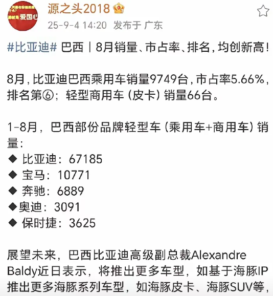 比亚迪巴西市场销量是真的好…… 观察比亚迪巴西市场销量有一段时间了,可以说巴西市场比亚迪稳步提升,8月比亚迪巴西市场销售9746辆,马上就要破万了,全市场排名也来到了第六名,市占率5.66%,创历史新高…… 向这种市场,市场容量大,同时又没有自己的品牌的地方,比亚迪要更激进一步……