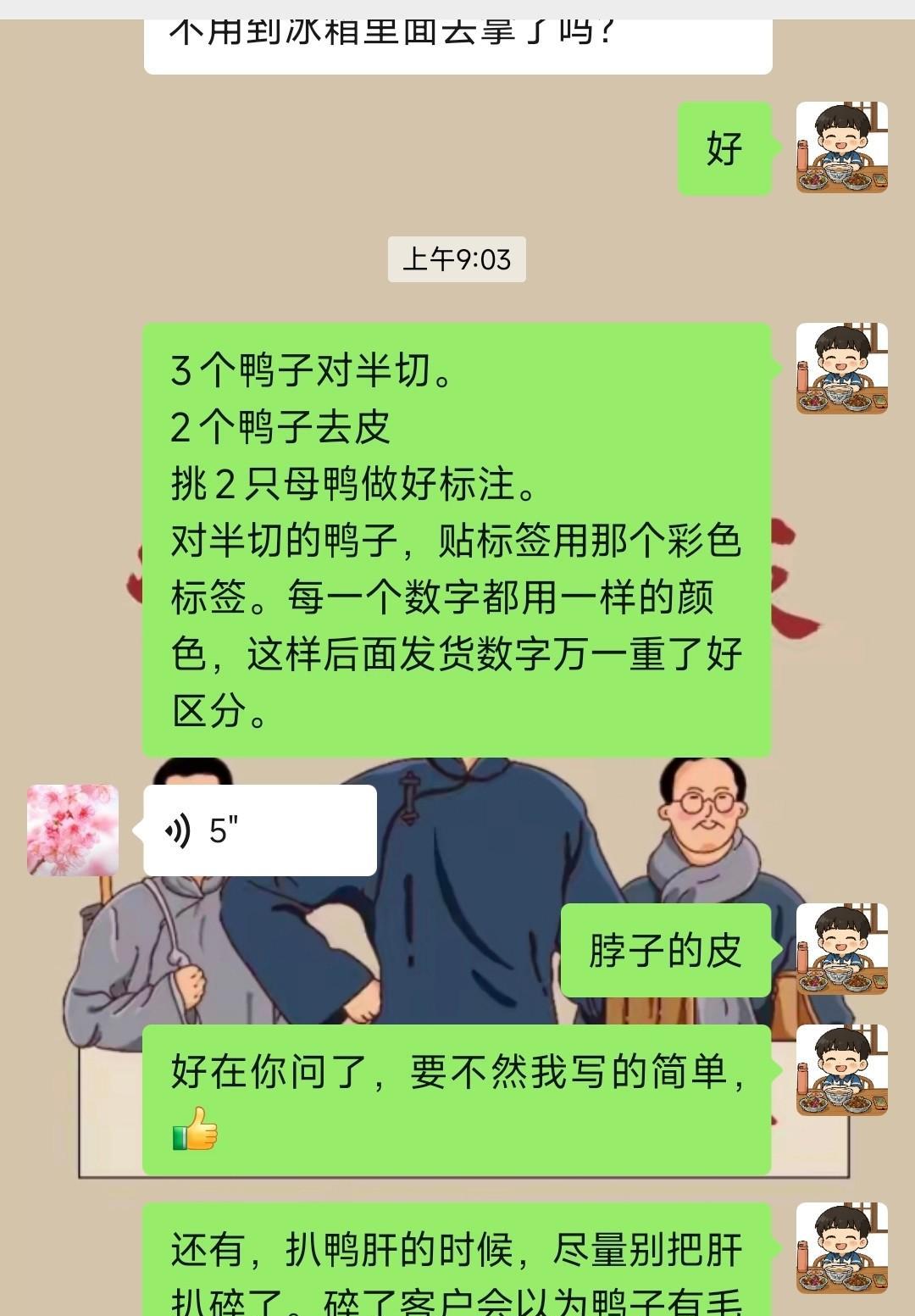 今天我们又杀鸭子了。 可惜我不在农场,所以一大早老公就打来电话,问我:那个鸭血是冷水下锅还是热水…… 这批鸭子是八月底预订的。当时说隔一周后杀。我本来想着一周后周六周日,我就回农场,趁我在的时候,杀鸭子我好放心,还能把鸭血留下来煮熟。 但算算日子,我这来去匆匆,怕也是没法安心参与这事。 老公说他自己安排周五开始杀鸭。 想着往后农场这生活,也只是靠他自己,孩子大了,我也只能一半农场一半家。 老公一大早就打来电话,问我鸭血是冷水下锅还是热水。我好奇他怎么把鸭血留下来了,之前是我在农场时,会叮嘱杀鸭师傅留下鸭血,我会花时间给它煮一煮。 煮鸭血是一件很麻烦的事,起个煤炉子,烧一锅水,一点点下入鸭血,有一会儿没一会儿用锅铲稍微推一推锅底,以免糊了。 这个时间特别久,有时候需要两三小时。 记得第一次煮鸭血时,就是锅底糊了,以至于其他的鸭血都带着糊味儿。 因为麻烦,所以我不在农场时,也就没跟他们提出,留鸭血。我估摸着他也不会主动揽事,因为他说他早晨3点就起床了,我问他起那么早干嘛?他说怕活干不完…… 说完自己打趣自己,说你不在我也得把这些事做好。 有人说,你老公对你可真好。这不,短短几句话又无形中表达了那份好不是。 我虽不在农场,可一大早送完孩子上学后脑子里也装满鸭子的事。 先是统计订单,随即把上次订单中出现的几个问题归纳下,再挨个发给工人。 发完了又给工人打了一个电话,语言叮嘱后又告诉她,仔细看我发的字,不明白问我。 为什么我要这么强调呢?从以往的一些事情上,我发现我跟工人之间的交流总是会有出入,就比如我今天写两只鸭子去皮。 这是我的问题,忘记写清楚,应该是"两只鸭子去脖子皮。” 换在以前,她可能不会问,直接给两只鸭子扒皮。因为曾经发生过同类事……我不能怪她,只能是自己沟通没清楚。 所以为了避免,我经常说,有不明白问我。 她今天真问了,两只鸭子扒皮是全扒还是拔脖子。 我当即给出纠正并给她一个赞。两个鸭子去脖子皮。有客户觉得我们拔鸭毛不容易,便说脖子去皮吧,反正我们也不吃。也有客户对鸭毛有挑剔,觉得拔不干净不行,听我说脖子皮最难拔,就说去皮吧。 跟工人交代这些事后又在脑子里转悠,还有什么事要交代。想起来,前几日有几个瘸腿鸭子,老公逮回来让工人单独宰了留着自家吃。这事很重要,我跟她说瘸腿鸭子单独放,千万别弄混了发给客户那就不好了。 还得叮嘱,给鸭子解剖时,扒内脏要注意,尽量别把鸭肝扒碎了,有时候手太用力,鸭肝扒碎了一些,客户拿到手可能会有疑惑,我还得解释很久。 为了避免这种疑惑存在,只能让工人尽量注意点。 虽然人不在农场,可心依然没离开那。像我们这种小规模的家庭农业,靠的大概也就是把这些细枝末节上事做好,做好了理顺了路也就容易多了。 你们说是不是。