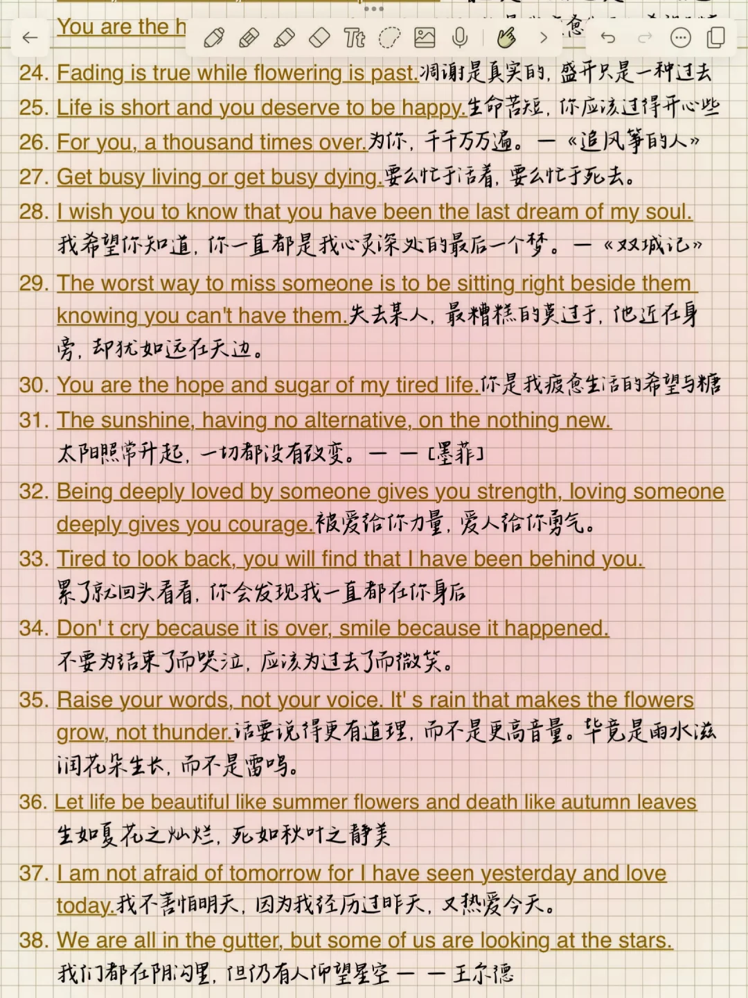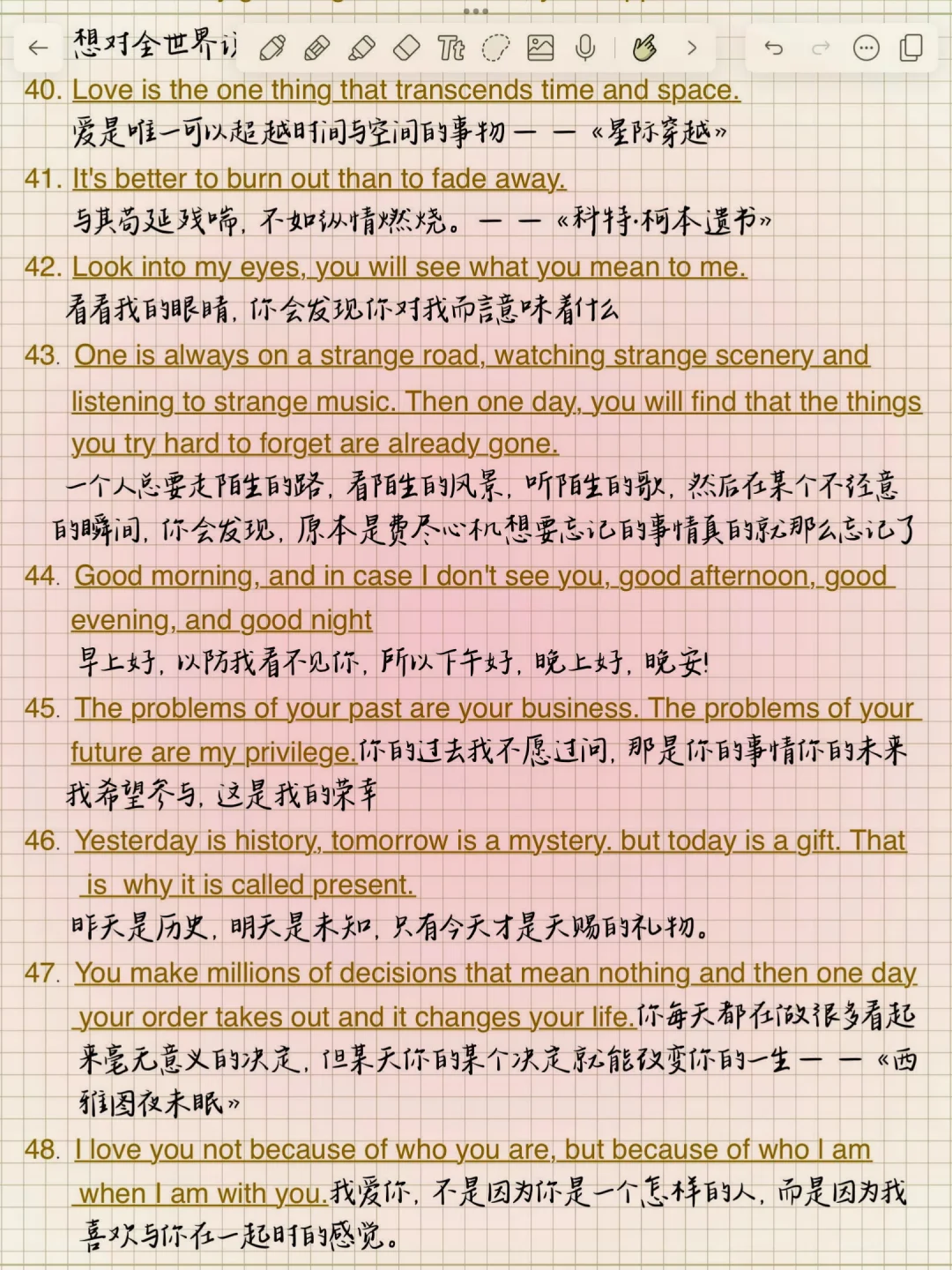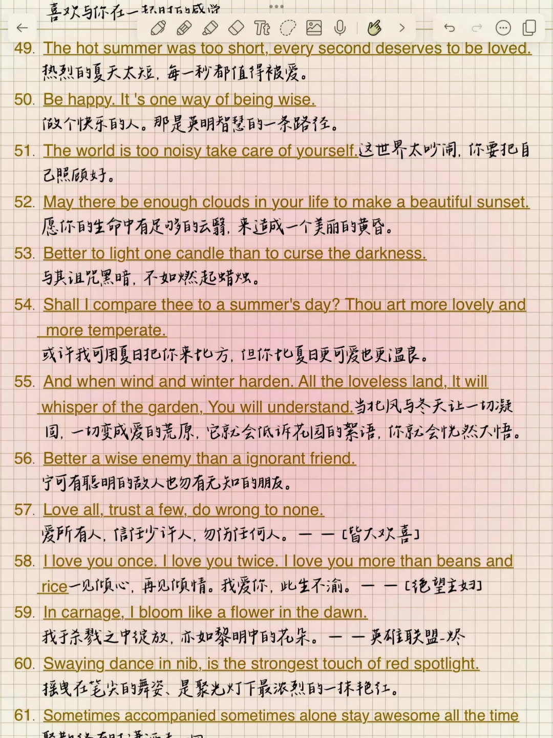 1. Meet you like the wind.遇见你,温澜如风。 2. Live long and prosper.生生不息,繁荣昌盛。 3. And forever has no end.永永远远,永无止境。 4. There is always a better way.总有更好的办法。 5. Better be your own universe.不如做自己的宇宙。 6. The longest day has an end.最难过的日子也有尽头。 7. No pains, no gains.一分耕耘,一分收获/不劳则无获! 8. I met you dead wood for spring.我遇见你,枯木逢春。 9. You are gentle with the sun set glow.你与霞光共温柔。 10. We all meet better ourselves.我们终将遇见更好的自己。 11. Born sensitive, lonely and happy.生而敏感,孤独而快乐。 12. May everything you meet be gentle原你所遇皆是温柔。 13. Whatever you do, do not let go!不管你做什么,都不要放弃! 14. We will go ashore in the sunshine.我们终将上岸阳光万里。 15. My journey is the stars and the sea.我的征途是星辰大海。