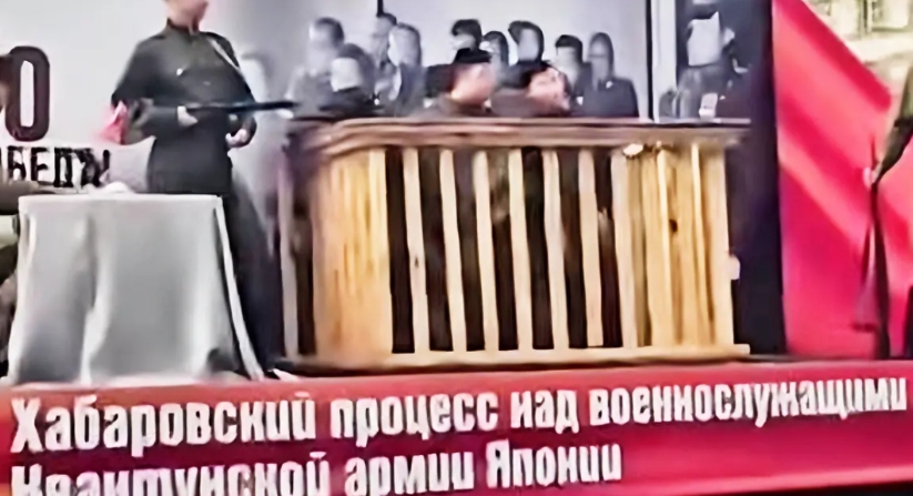当然,最亮眼的要数那段俄文了,翻译成中文就是,哈巴罗夫斯克对日本关东军战犯的审判。